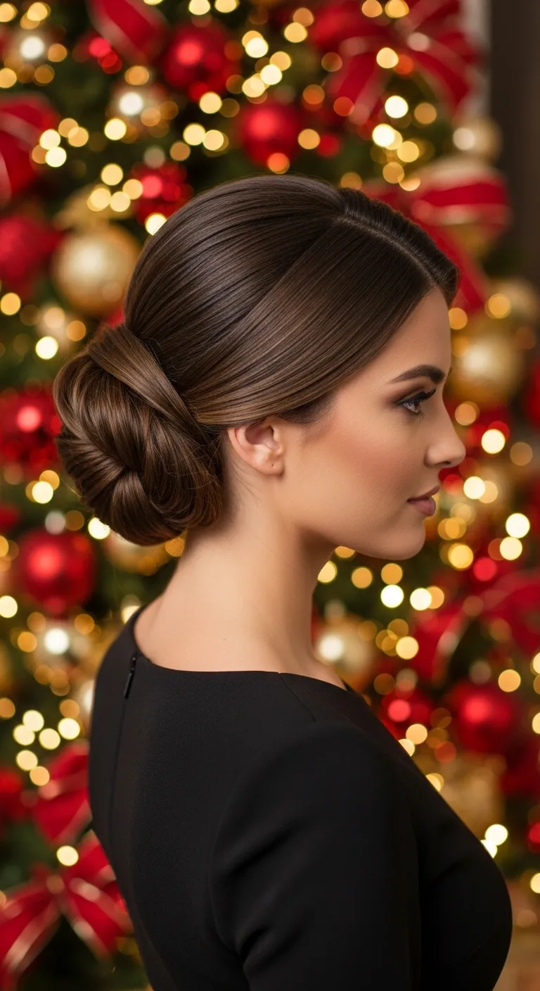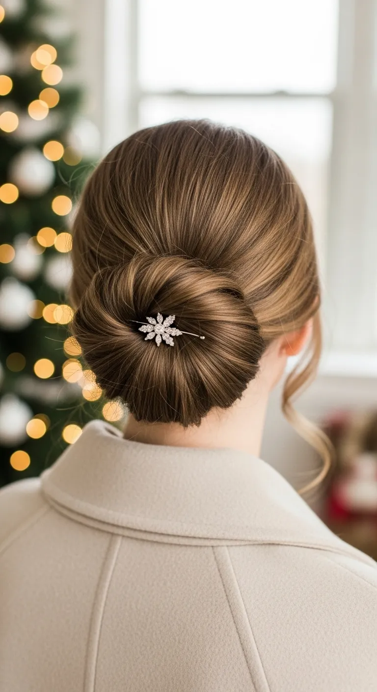 A low twisted bun gives a calm and tidy look without taking long. Brush your hair back and tie a low ponytail. Twist it gently and wrap it into a bun. Secure it with two or three pins. You can make it loose for a soft vibe or keep it tight for a cleaner finish. Add a thin ribbon in red or green for a holiday touch. This style sits well through long events, even outdoors. If your hair slips easily, use a small amount of light-hold spray before twisting. You don’t need salon products. Regular bobby pins and any ribbon you already have work fine. This bun pairs well with turtlenecks, dresses, and warm coats.