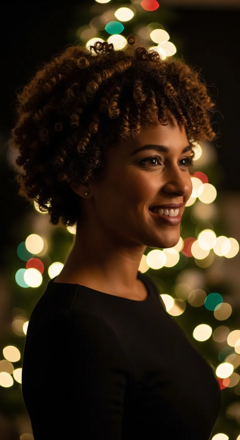 A curly puff highlights natural texture beautifully. Gather your curls at the crown with a soft band. Fluff the curls gently for shape. Add a satin ribbon or small holiday clip for charm. Use your favorite curl cream or a little water to refresh curls before styling. This is quick, gentle, and protective. It works well for long events and keeps your curls comfortable. Pair with big earrings for a festive touch.
