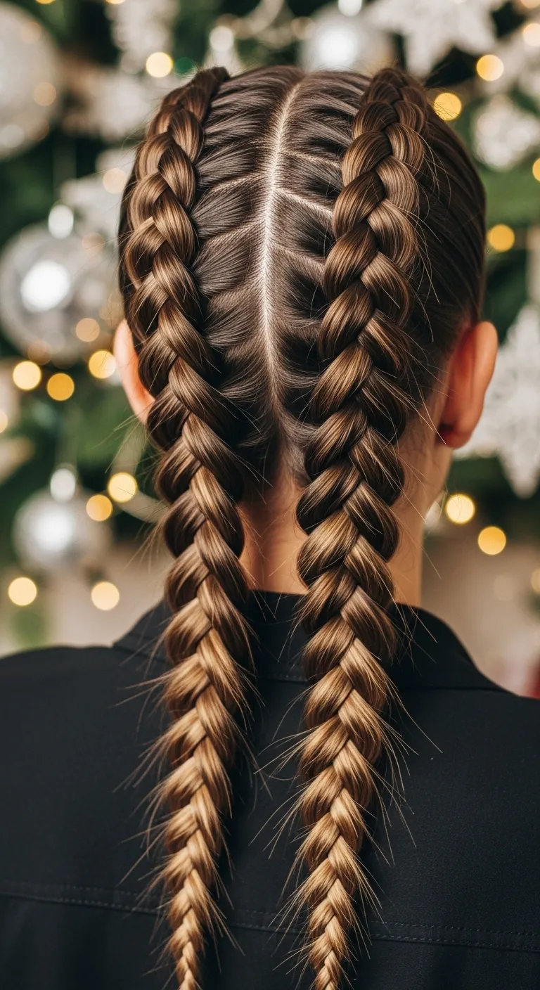 Double Dutch braids offer a clean, sporty look for casual Christmas gatherings. Part your hair down the middle and braid each side. Tug softly on the braids to make them fuller. Add holiday bows at the ends if you want extra style. This works well on medium and long hair. It keeps everything in place through busy outings. If your hair is fine, add dry shampoo for texture. It’s simple and practical for all-day wear.