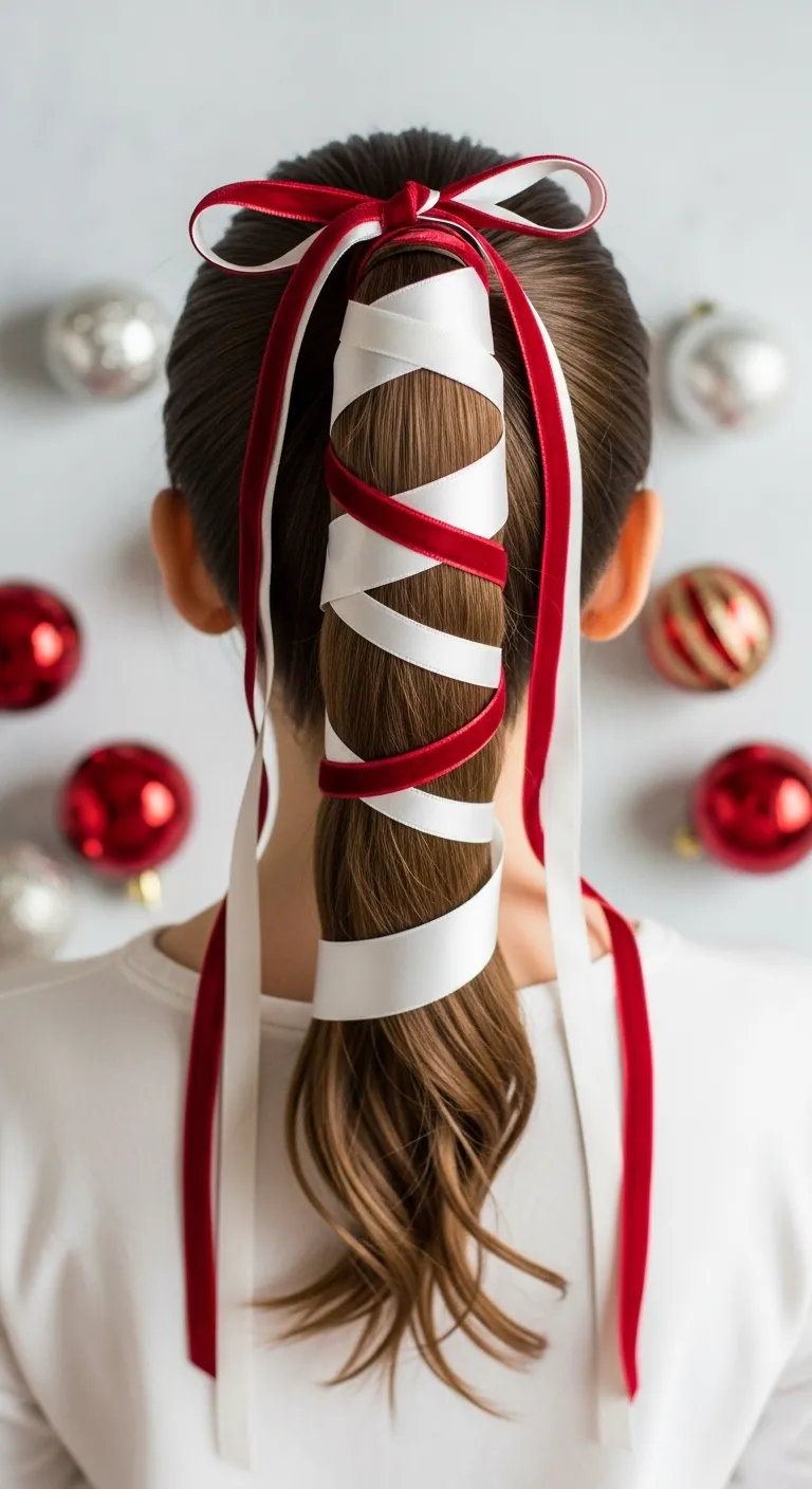 This style looks festive without effort. Tie your ponytail and wrap a long ribbon around the length. Secure the ends with a pin. Choose satin, velvet, or any ribbon you already have. Curl the ends if you want softness. This works on all hair lengths that can form a ponytail. It’s a cute choice for family gatherings or school events.