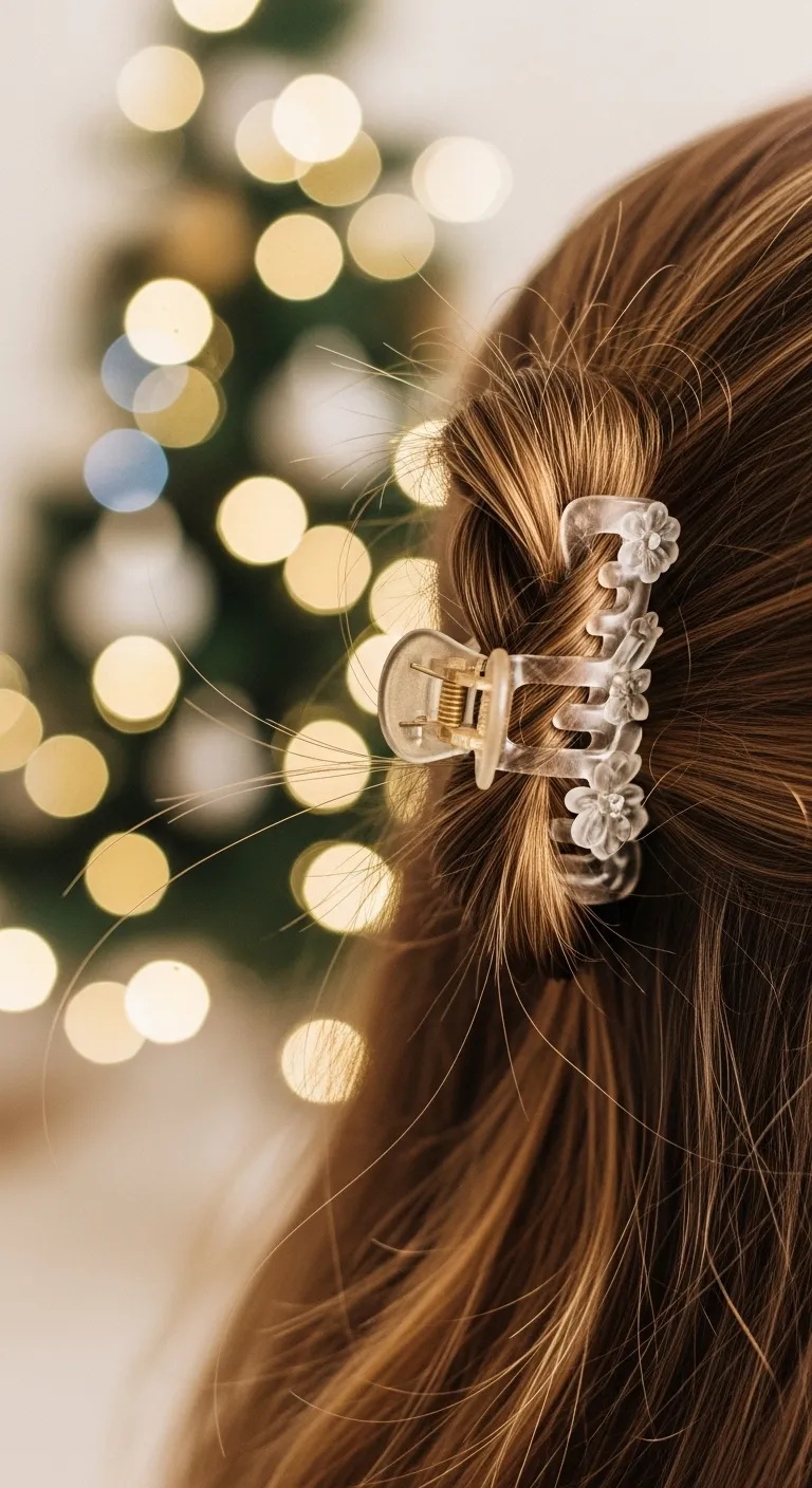 Clipping back the sides gives a clean, open look. Part your hair in the middle or slightly off to the side. Pin each side with matching clips. Add curls or waves if you want texture. This style works on all lengths. Use clips you already have or choose holiday-themed ones. It keeps hair out of your face for eating, photos, and talking with guests.