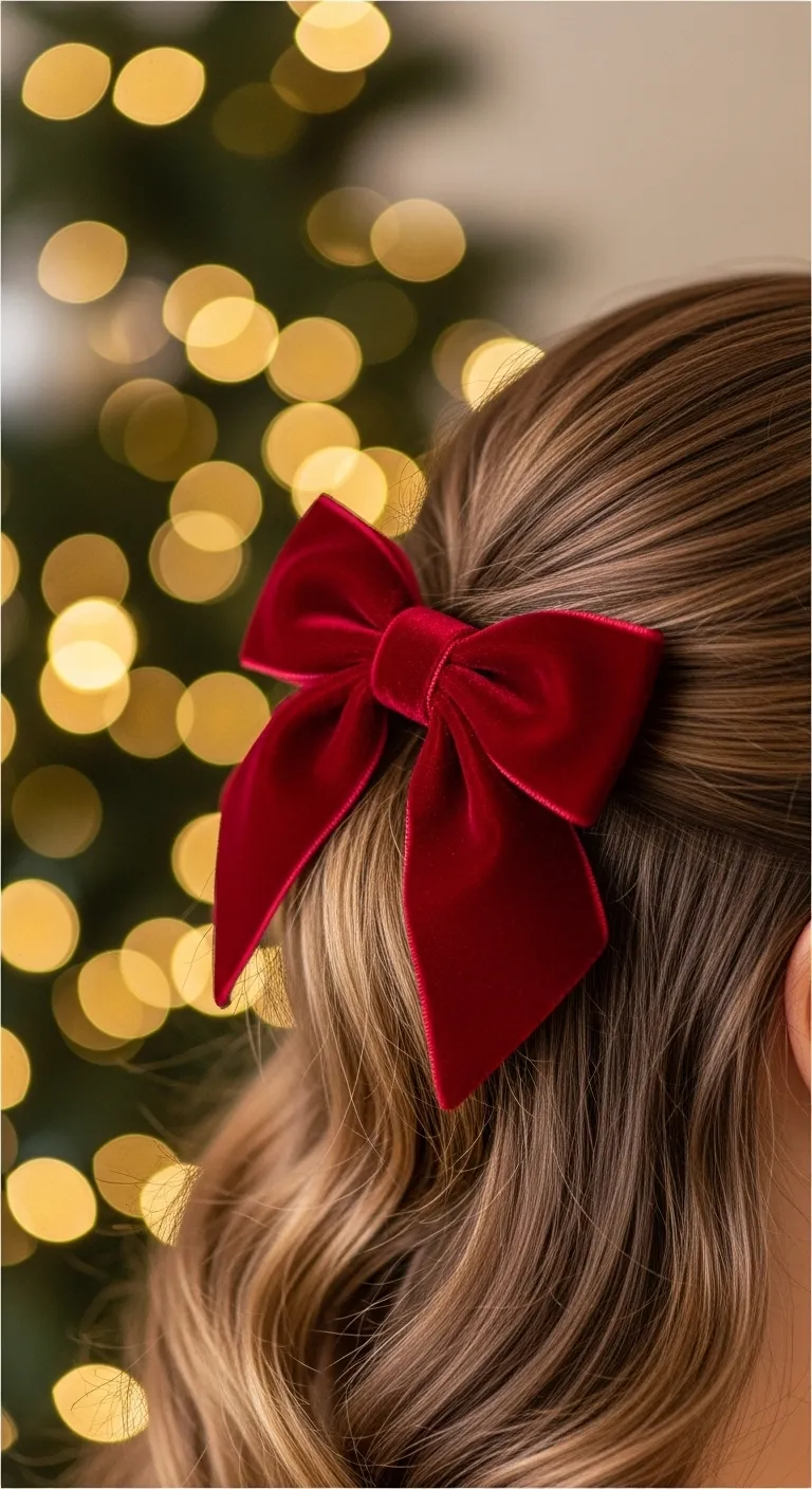 A simple side part becomes holiday-ready with a velvet bow. Part your hair deeply on one side. Smooth the top with a brush. Add a velvet bow clip near your ear. You don’t need extra styling unless you want curls or waves. This looks charming on all hair lengths. Velvet bows are inexpensive and easy to reuse.