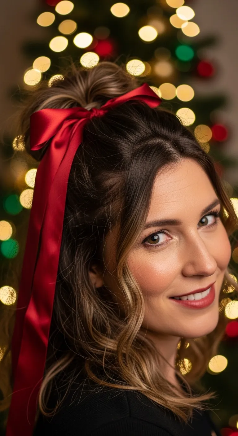 The half-up ribbon tie is simple and charming. Take the top half of your hair and secure it with a small elastic. Wrap a ribbon around the base. Choose a color that matches your outfit. Satin, velvet, or even leftover gift ribbon works well. Curl the loose ends for a soft touch, or keep them straight for a neat look. This option suits short, medium, and long hair. It takes only minutes and looks great in photos. If your hair feels flat, flip your head and shake it before styling. A small teasing comb can add height at the crown without effort. This style works for dinner parties or family photos.