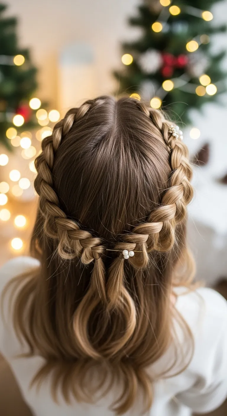 A loose braided crown feels festive and gentle. Create two braids on each side of your head. Bring them across the top and pin them in place. Let a few face-framing pieces fall out for a relaxed feel. You don’t need strong skills. Simple three-strand braids work fine. If your braids look too tight, pull them apart softly to give them volume. Add small clips or pearl pins for holiday sparkle. This style works well on medium to long hair. If your hair slips, spray a little dry shampoo before braiding. It adds grip and keeps everything steady.