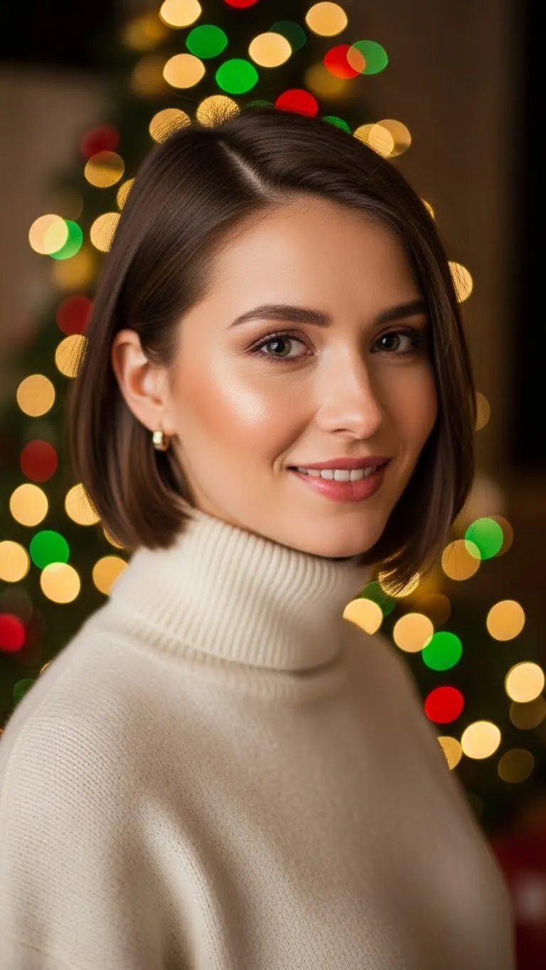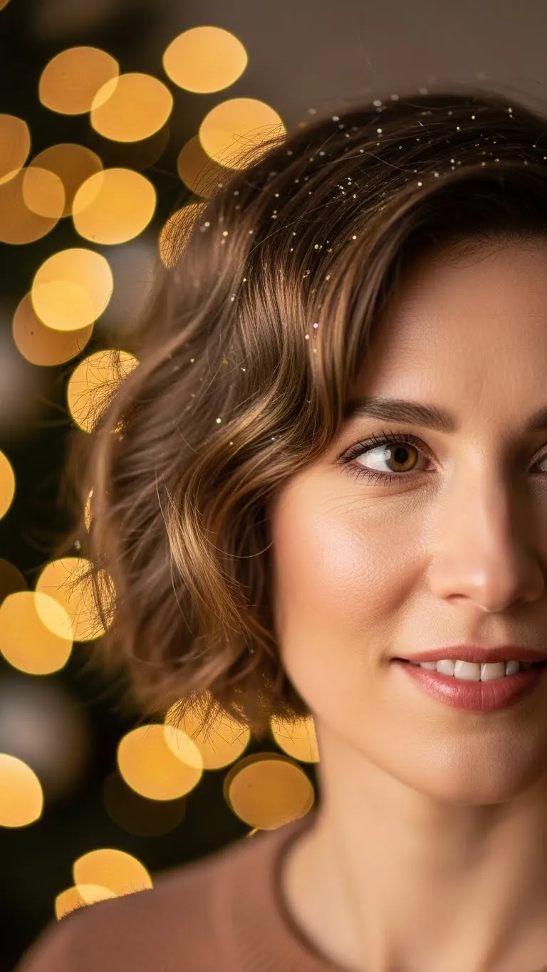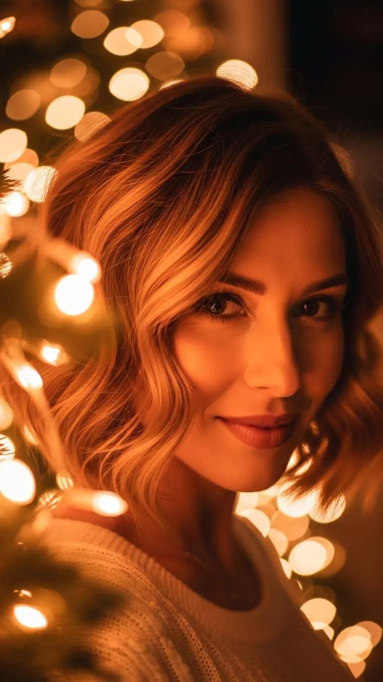 Soft waves give short bobs a gentle holiday feel. Use a curling wand or flat iron to bend sections lightly. Keep the waves loose so the style stays soft. Apply a bit of shine serum to the ends for glow. If your hair struggles to hold waves, spray it lightly with a flexible-hold product first. This adds grip without making the style heavy. Part your hair slightly off-center for a balanced shape. Add a simple clip or small accessory for a holiday finish. These waves look natural and take less time than tight curls. It’s a great option when you want something pretty but relaxed.