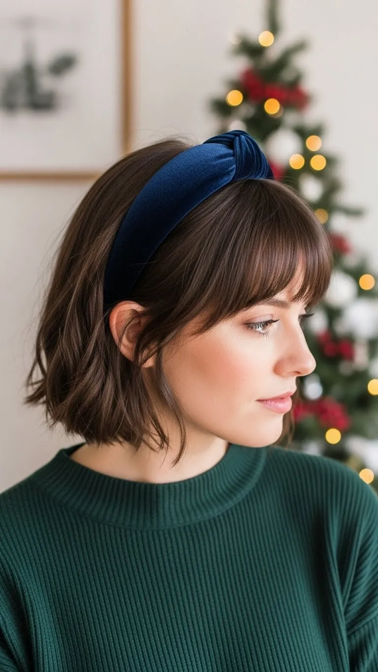 A velvet headband instantly dresses up short hair. Brush your hair back and place the headband about an inch behind your hairline. Push the crown slightly upward with your fingers to add light lift. Velvet gives a soft holiday vibe and feels comfortable for long wear. You don’t need any styling skills for this. Keep a few strands loose around your face if you want a relaxed touch. Choose headbands in deep colors like wine, emerald, or navy. They’re budget-friendly and reusable. This style keeps hair off your face during meals and gatherings. It works with straight, wavy, or curly short cuts. If your hair is extra fine, spray a bit of dry shampoo before wearing the headband so it doesn’t slip. It’s one of the quickest ways to look more put-together.