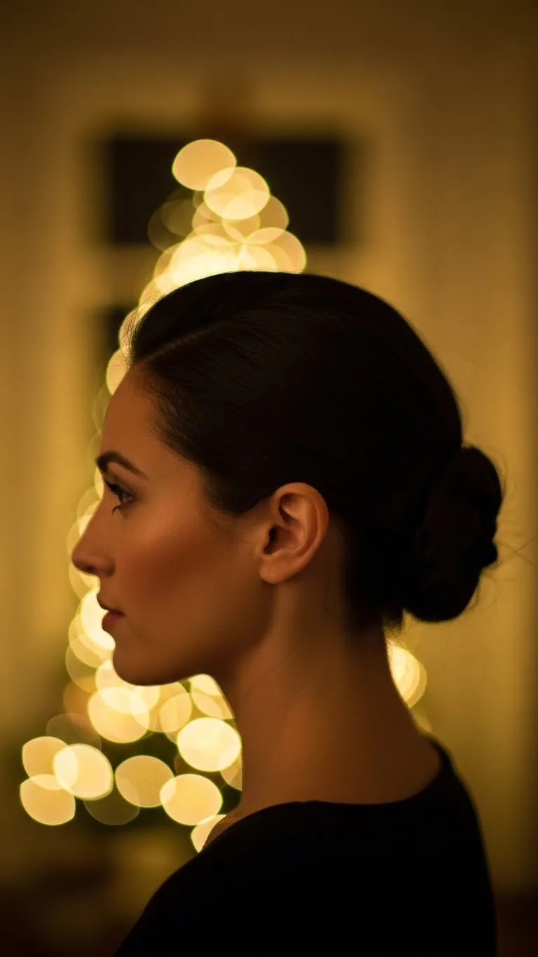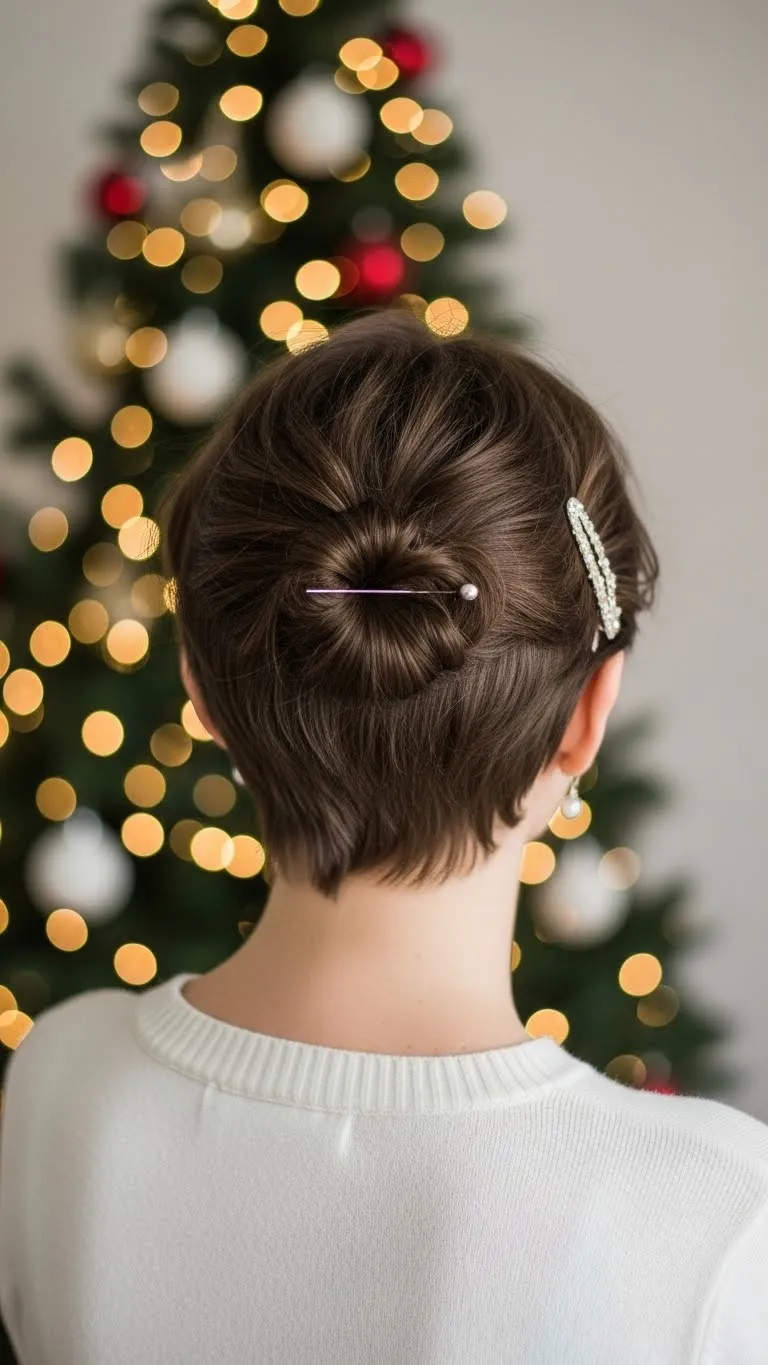 Even very short hair can mimic a tiny bun. Gather the back section and twist it slightly. Use bobby pins to create a small rounded shape. It doesn’t need to look like a full bun—just a small knot impression. Smooth the sides with a little gel for a clean look. Add a festive pin near the knot for charm. This style looks cute with holiday outfits and feels secure. If your hair is extremely short, twist only the middle section and pin it tightly. The illusion still works. For shine, use a drop of hair oil on your hands and smooth lightly. This is perfect when you want something tidy but not time-consuming. It holds well even through dancing or long events.