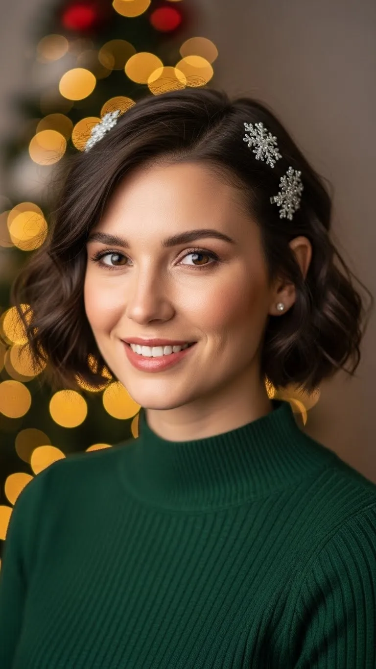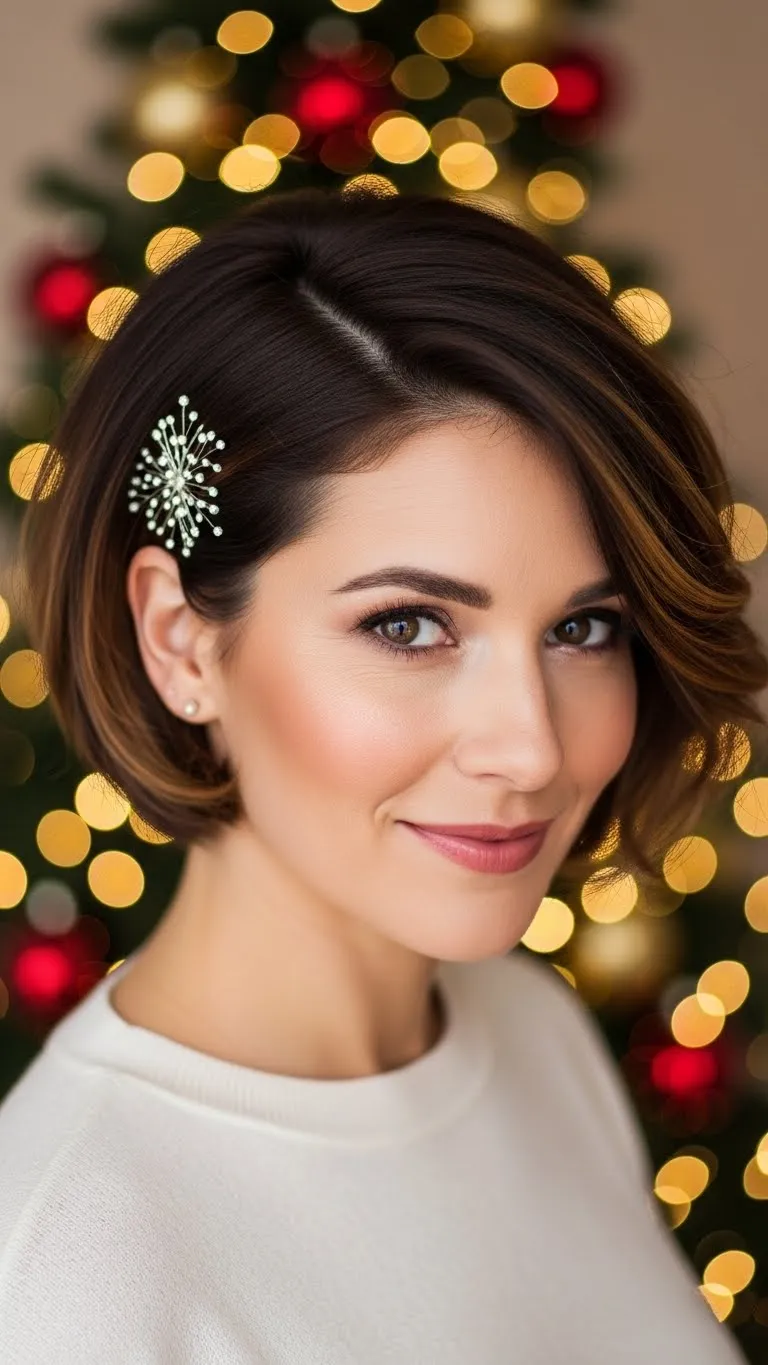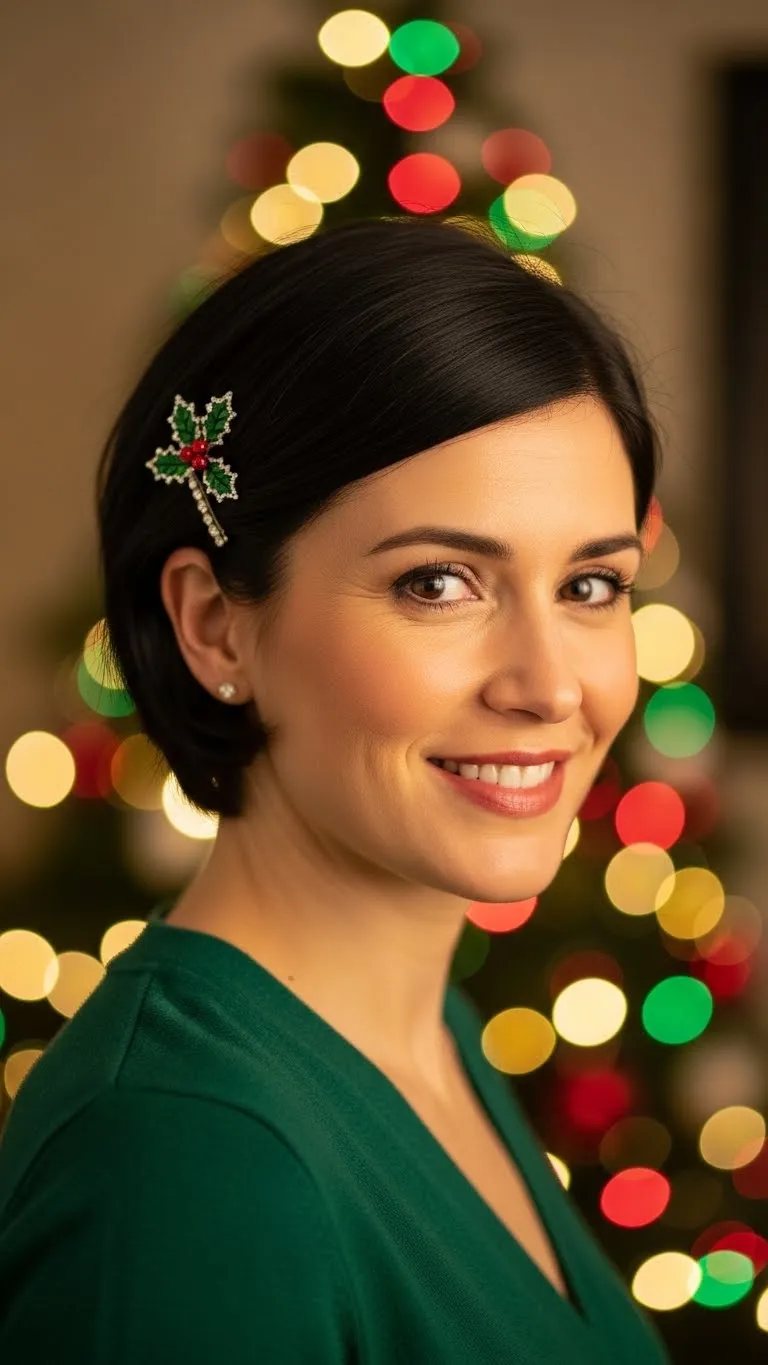 A side puff gives short hair a bit of shape. Create a deep part and lift the heavier side gently with your fingers. Pin the puff close to the scalp. Use a small amount of hairspray for hold. This works when you want volume without heat tools. Add a holiday clip behind the puff if you want shimmer. This style balances the face and keeps things simple. It’s great for everyday wear or gatherings where you want something quick. If your hair falls flat easily, use a touch of mousse before styling.