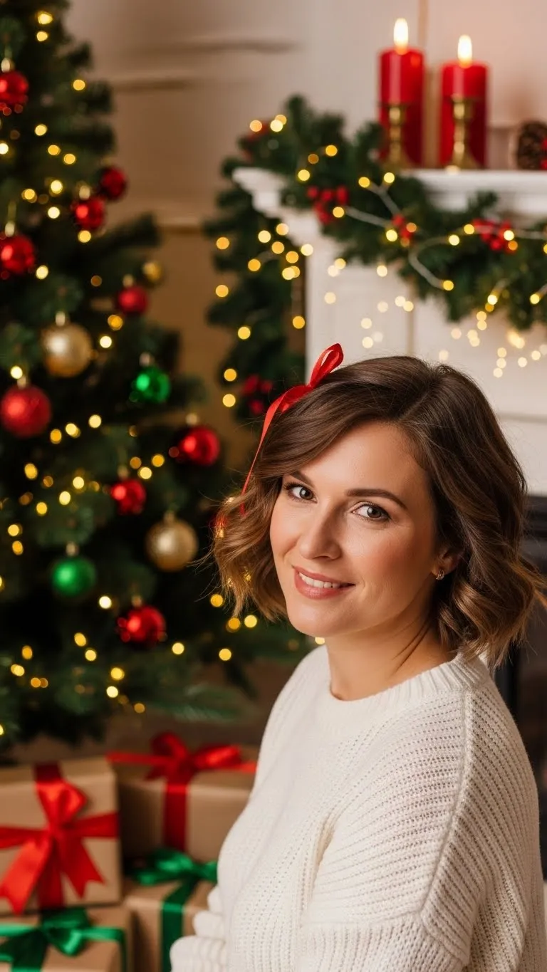 A ribbon adds softness to short hair. Sweep your hair to one side and secure a small section with a ribbon. Pick red, gold, or deep green for holiday charm. Tie it once or twice so it doesn’t look bulky. If you want more volume, lift the crown slightly with your fingers before tying. This style works well when you want something simple and sweet. You don’t need heat or heavy products. A ribbon costs almost nothing and can be reused many times. This side sweep suits all textures—straight, wavy, or curly. It’s perfect for family gatherings, photos, or casual holiday outings.