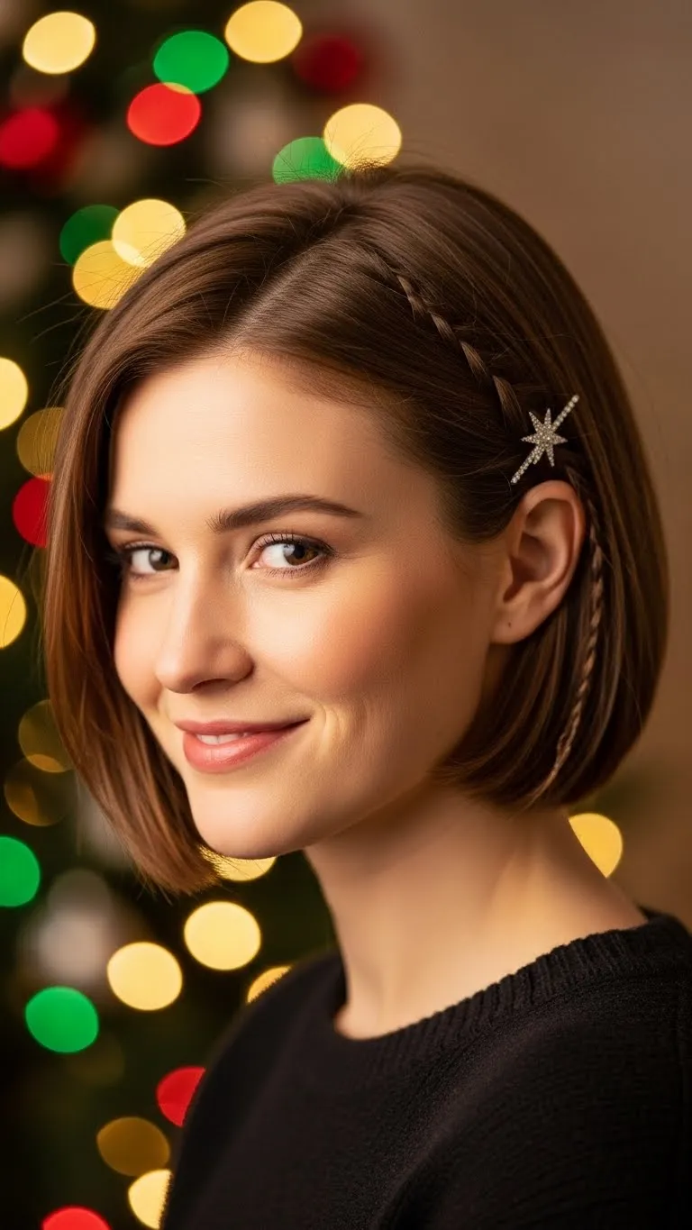 A small side braid works beautifully on short hair. Take a thin front section and braid it straight back. Keep it close to the scalp, then tuck it behind your ear. Use a tiny bobby pin to hold it in place. If your hair slips easily, spray a little dry shampoo before braiding. It adds light grip without stiffness. Add a mini red or green clip near the ear to turn this into a holiday look instantly. This style takes under three minutes and doesn’t need heat tools. If the braid feels too thin, grab a slightly larger section next time. It still looks simple but carries more texture. Wear it with loose hair or pair it with soft waves if you have time. The neat braid pulls your face shape into focus without effort. It’s a go-to idea when you want something quick that still looks planned.