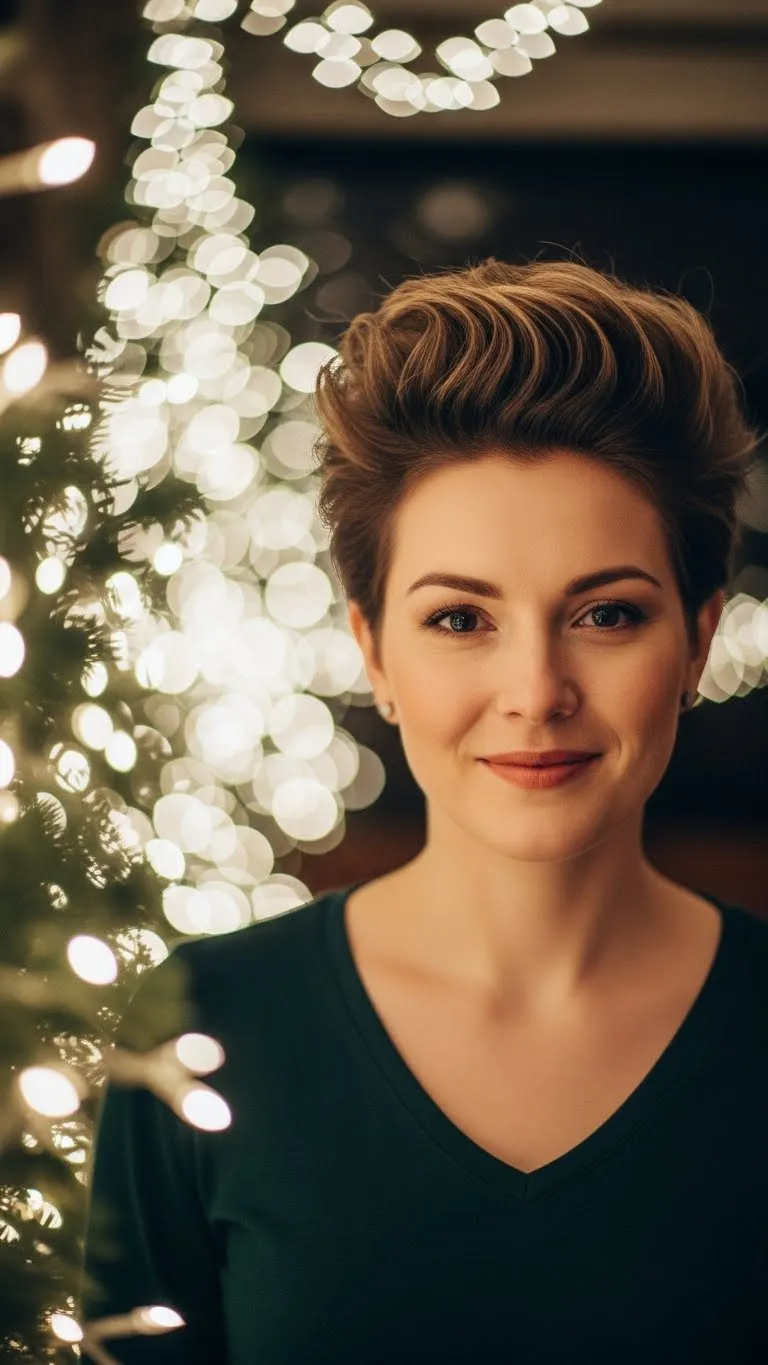Curly pixies look lively and playful. Dampen your hair and apply a curl cream or mousse. Scrunch upward to encourage shape. Let it air dry or use a diffuser if you have one. If your curls fall flat easily, use a strong-hold mousse but apply lightly so the hair doesn’t feel crunchy. Add one cute clip on the side if you want extra holiday charm. Keep it small so it doesn’t overwhelm your short cut. This style works great for natural curls or heat-created curls. If your hair is straight, wrap small sections around a tiny wand, holding each curl for a few seconds only. Touch them up as needed. You don’t need perfect curl patterns; a mix of loose and tighter curls looks fun. Wear this when you want a soft, lively look for gatherings. It adds texture, shape, and movement without much effort.