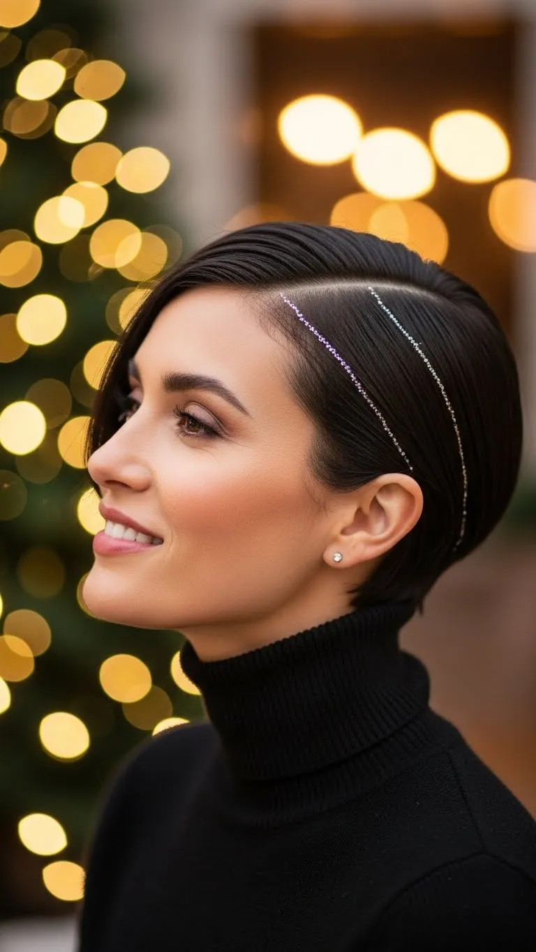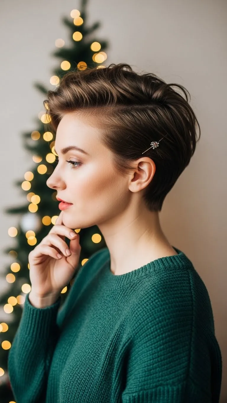 A pin cluster adds instant holiday charm. Place three to five small pins on one side of your head. Mix shapes like stars, pearls, or crystals. Keep them close together so they look intentional. This works even on very short layers. Brush your hair to one side for a clean base before adding the pins. If you want extra hold, spray the side lightly first. This helps grip the pins without pulling the hair. These pins cost very little and can be reused for other occasions. You can place the cluster high near the temple or low near the ear. Both angles look cute and festive. It’s a fast, simple way to dress up any short hairstyle.