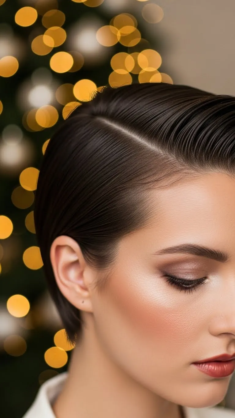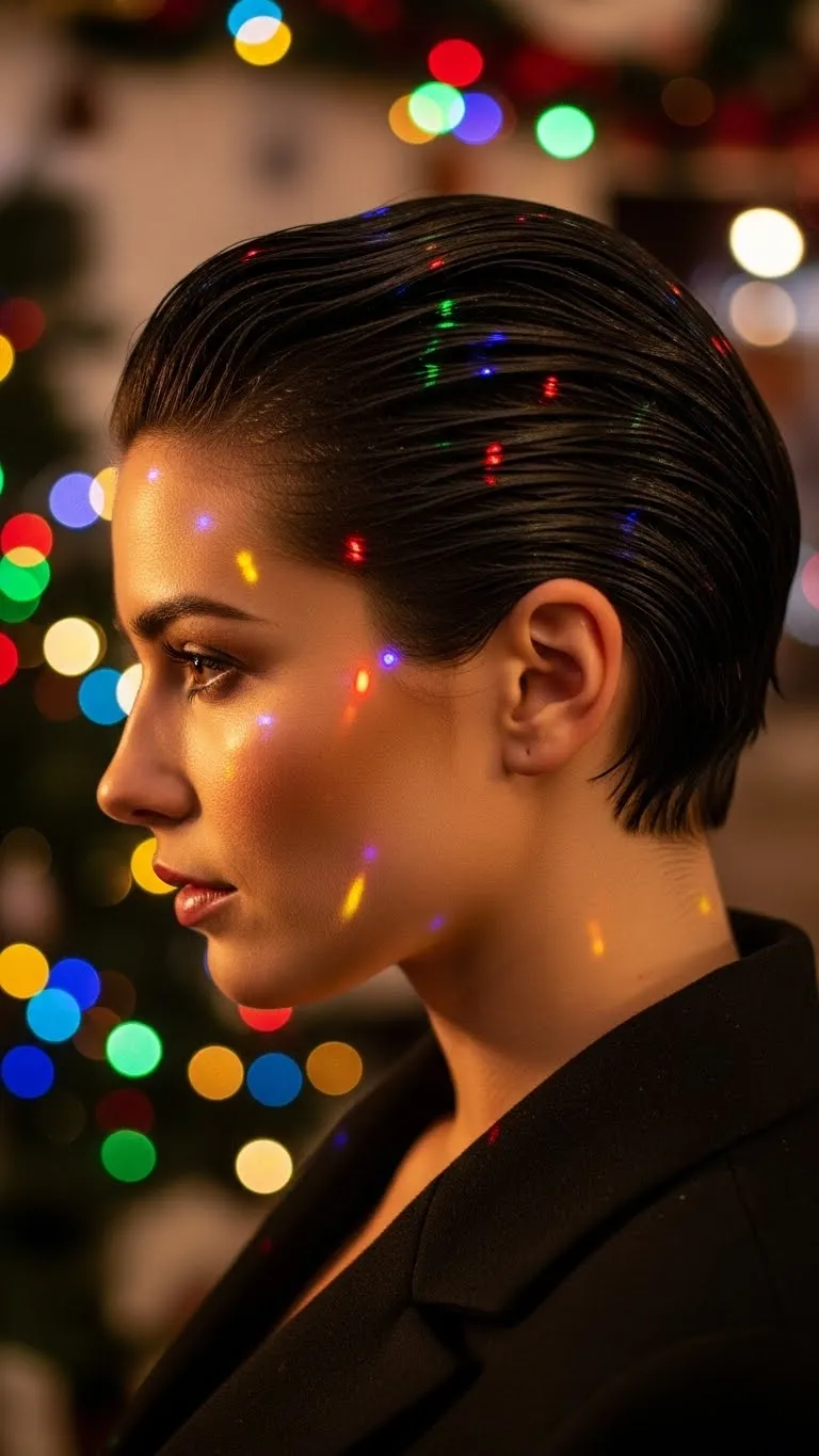 A wet look is bold and smooth. Start with damp hair and apply a generous amount of gel through the roots. Comb everything straight back. Add a little shine serum or hair oil to strengthen the glossy effect. Press the sides gently with your palms so the shape stays sleek. This is perfect when you’re short on time. You can wear it sharp and clean or softer with gentle finger waves. It pairs well with sparkly makeup or simple outfits. If you want subtle holiday flair, place a tiny crystal clip above one ear. It won’t distract from the sleek style but adds a festive touch. If you’re on a budget, mix equal parts gel and leave-in conditioner for shine. This style lasts long and stays neat even in cool weather.
