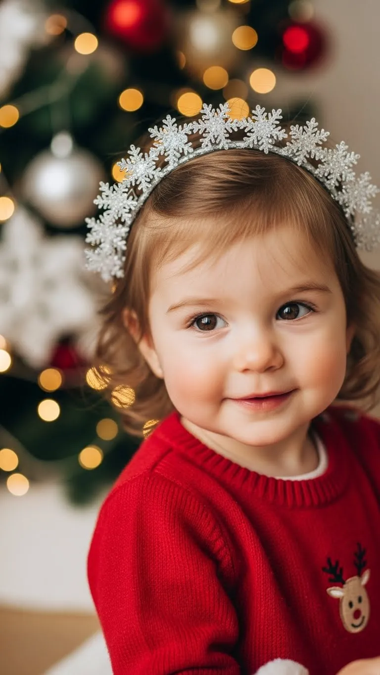 Place tiny snowflake clips across the top of the head, forming a crown shape. Spread them evenly for a tidy look. Brush the hair lightly to smooth flyaways. This works with any hair length. If you want a softer finish, curl the ends of her hair around your finger. You can make your own snowflakes using glitter paper and attach them to snap clips. Keep the clips spaced out so they stay secure.