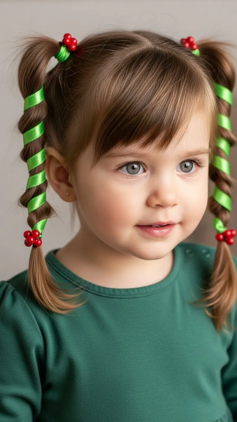 Divide the hair into two sections and twist each side before tying the pigtails. Wrap thin green ribbon around the twisted parts. Add tiny red bead clips for a holly effect. Keep the twists loose so they don’t pull. A helpful tip is to use soft, stretchy elastics so the style stays comfortable. You can reuse the same green ribbon for many holiday looks.