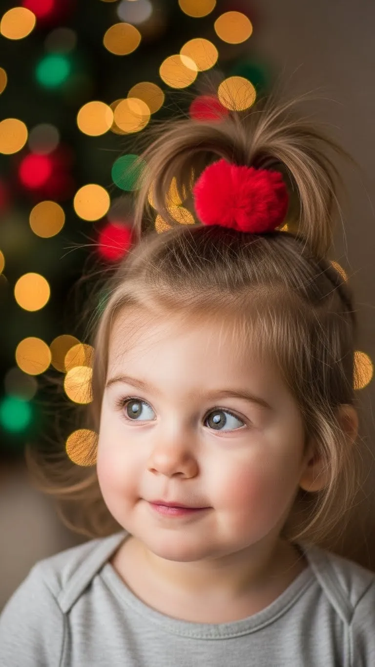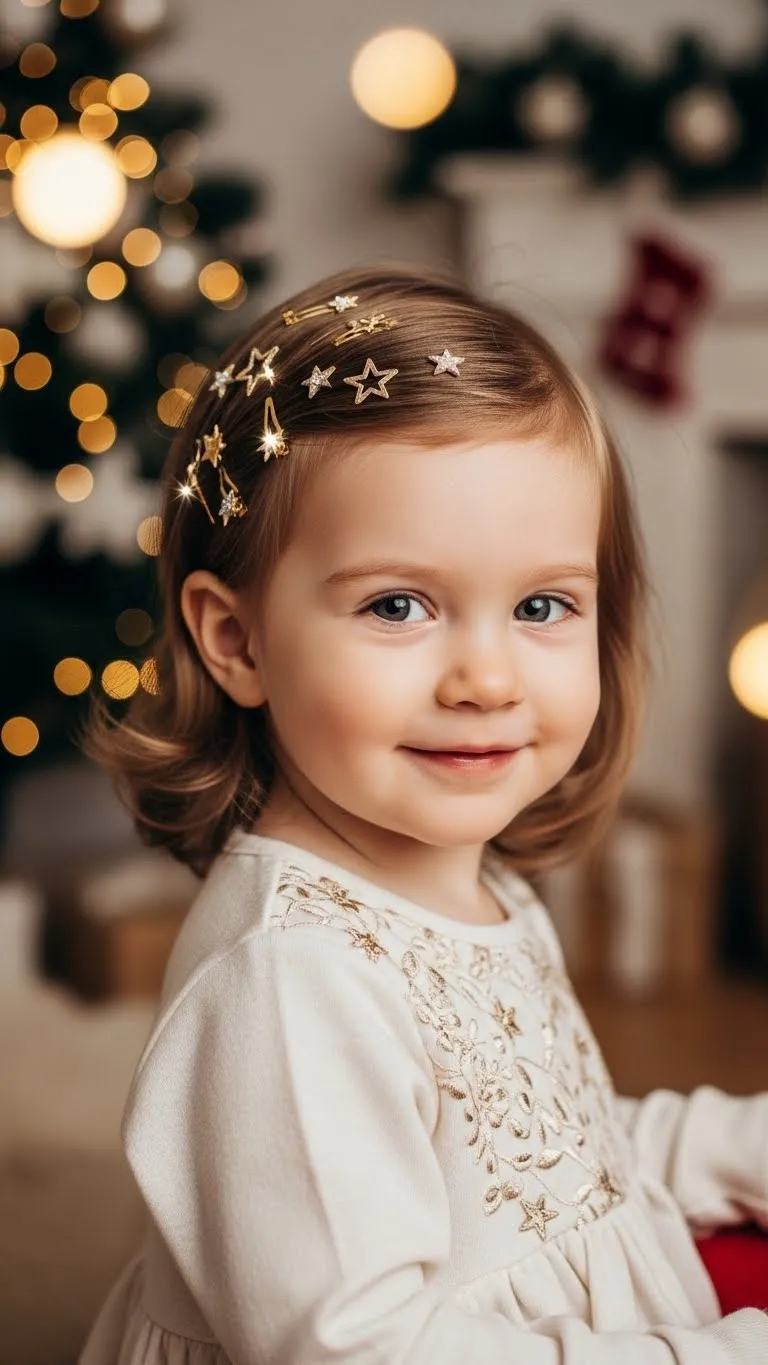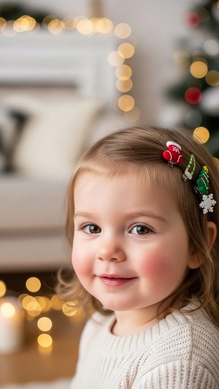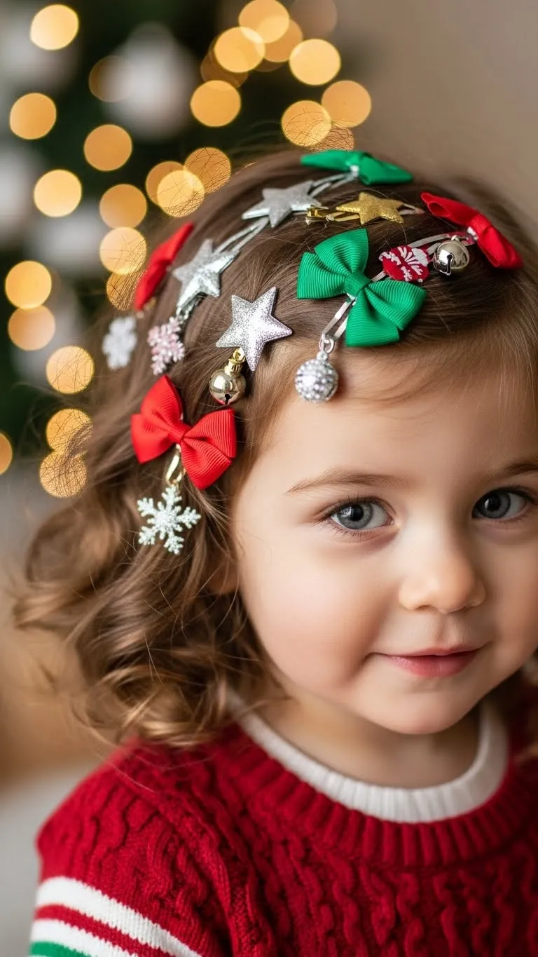 Use small bulb-shaped clips to mimic Christmas lights. Scatter them around the head or line them along the side. This style looks adorable in holiday photos. Keep the clips lightweight so they stay safe. You can craft your own using tiny craft bulbs and glue. Pair this look with a simple pony or leave the hair down.