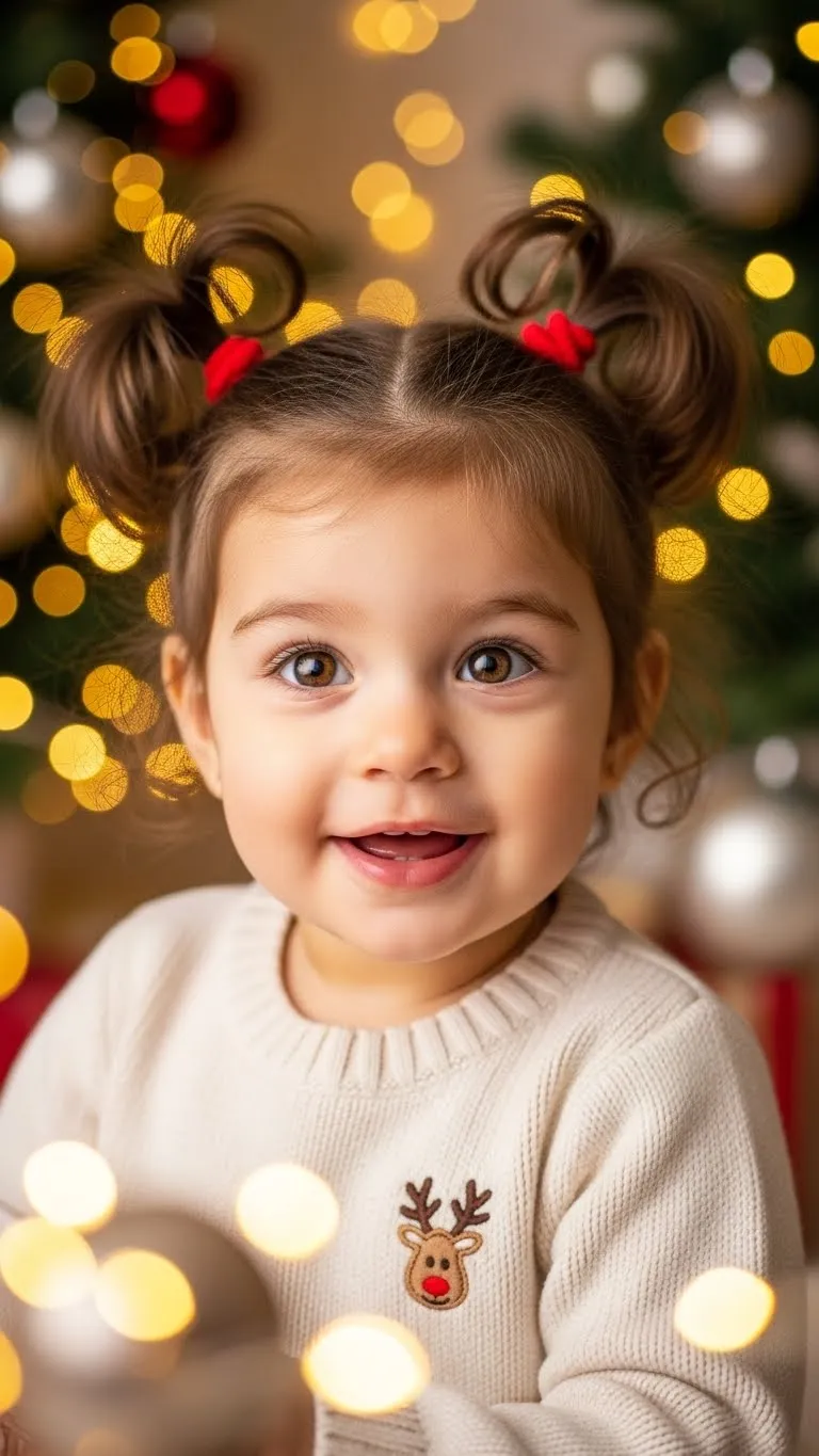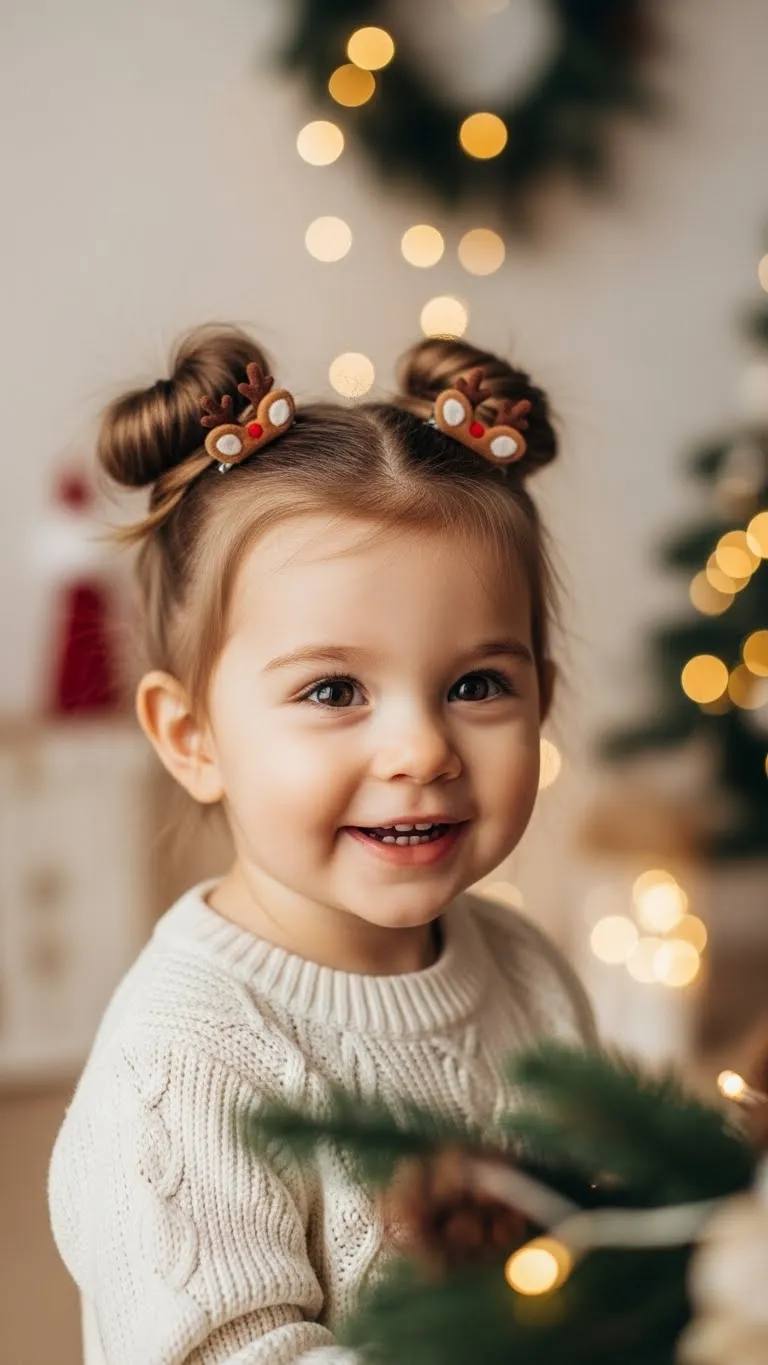 Create two mini buns high on the head. Leave them small so they stay comfy. Add little reindeer-ear clips for fun. These clips are easy to find, but you can also cut simple ear shapes from felt at home. Use brown, beige, or glittery gold felt. Attach them to plain snap clips. Keep the buns loose to avoid tugging. For extra charm, place a red pom-pom clip in the center to mimic Rudolph’s nose.