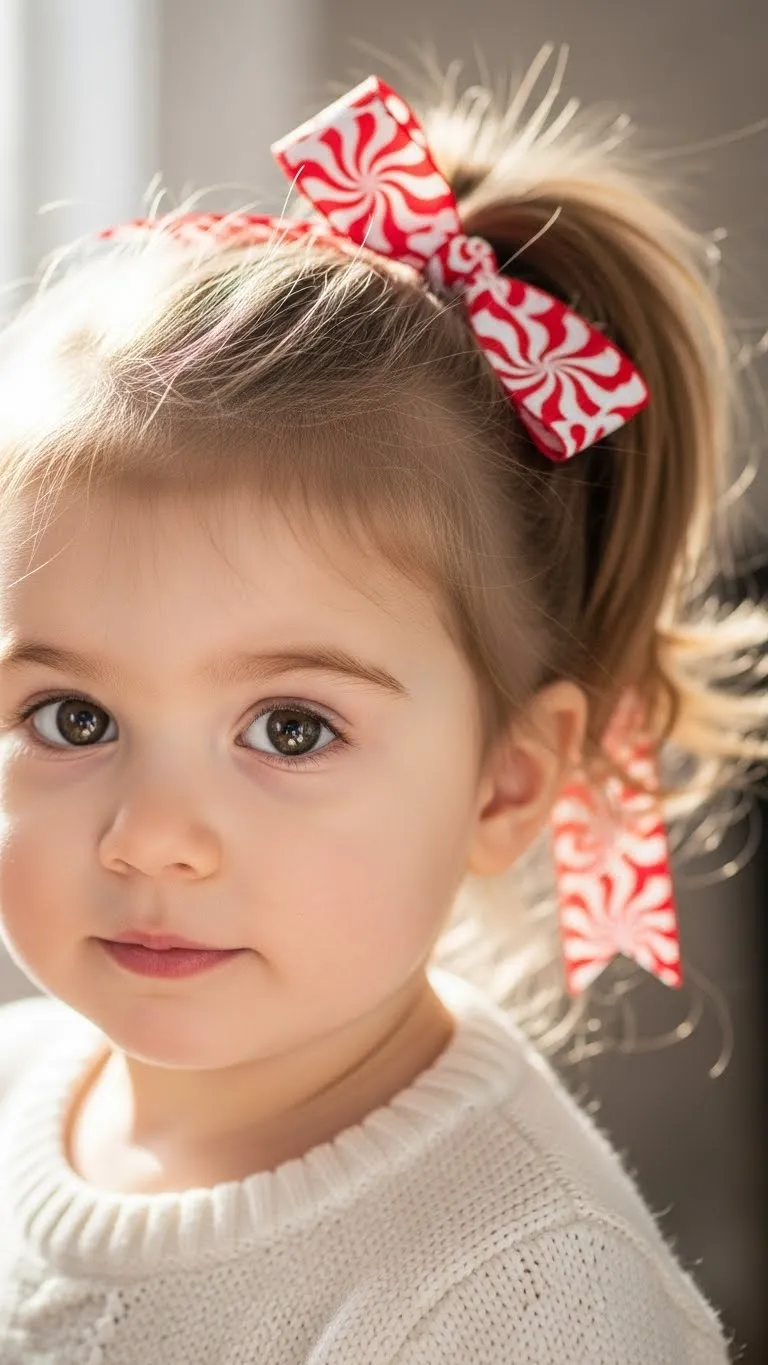 Take two front sections of hair and twist them back. Clip in red-and-white striped ribbon pieces to mimic candy cane stripes. This takes less than five minutes. Keep the twists loose so your toddler stays comfortable. If she has fine hair, dampen the strands lightly before twisting. Use mini claw clips instead of bobby pins to avoid slipping. Ribbon strips from gift wrapping work well and cost almost nothing. Just cut them thin so they don’t feel heavy.