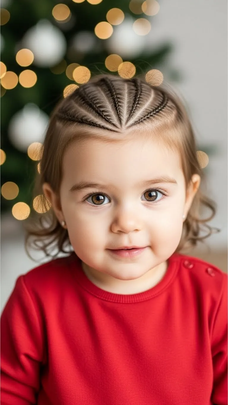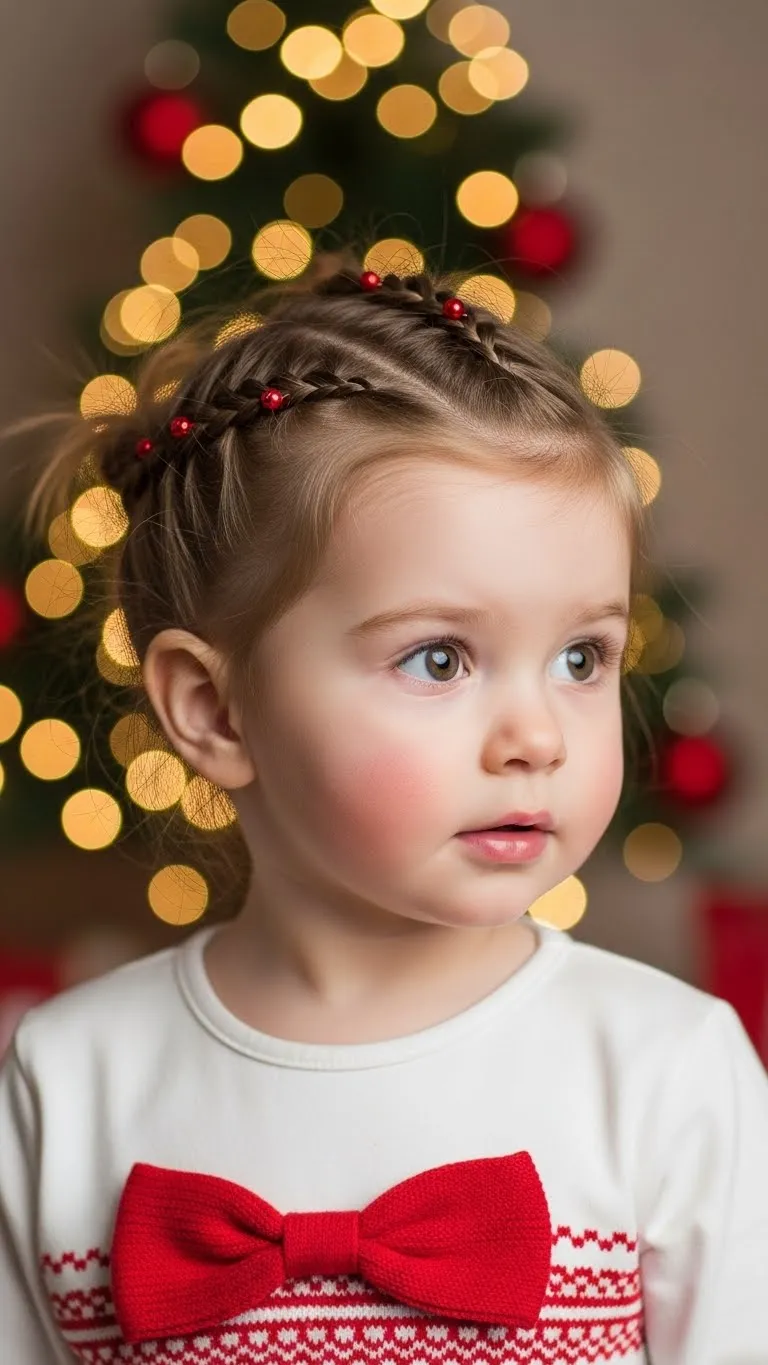 Make two skinny braids along each side of the head and cross them over the top like a headband. Secure them behind the ears with small elastics. This keeps hair out of her eyes during activities. The braid size stays light and gentle. Add a small holly clip behind one ear for a holiday detail. If braiding feels tricky, make tiny twists instead. You can also weave a thin red thread through the braid for a cute pattern without buying anything new.