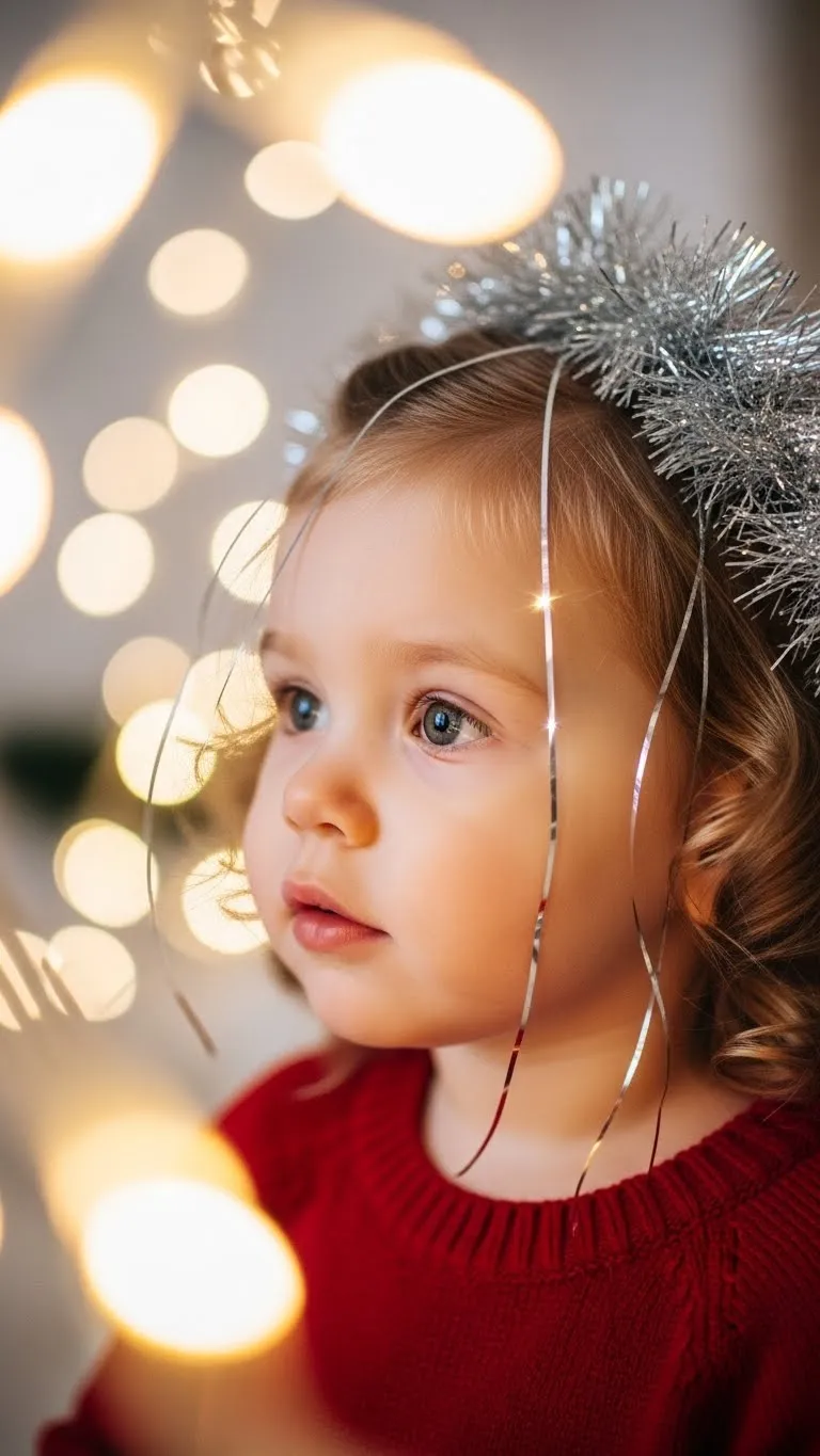 Clip a few tinsel strands underneath the top layer of hair for sparkle without weight. Only add two or three pieces so it stays safe for toddlers. Make a simple ponytail or leave her hair down. The shimmer shows with movement, which looks cute in photos. Choose lightweight tinsel to avoid tangles. A budget-friendly option is cutting thin strips from metallic gift wrap. Tie them gently to small elastics near the roots so you can remove them easily.