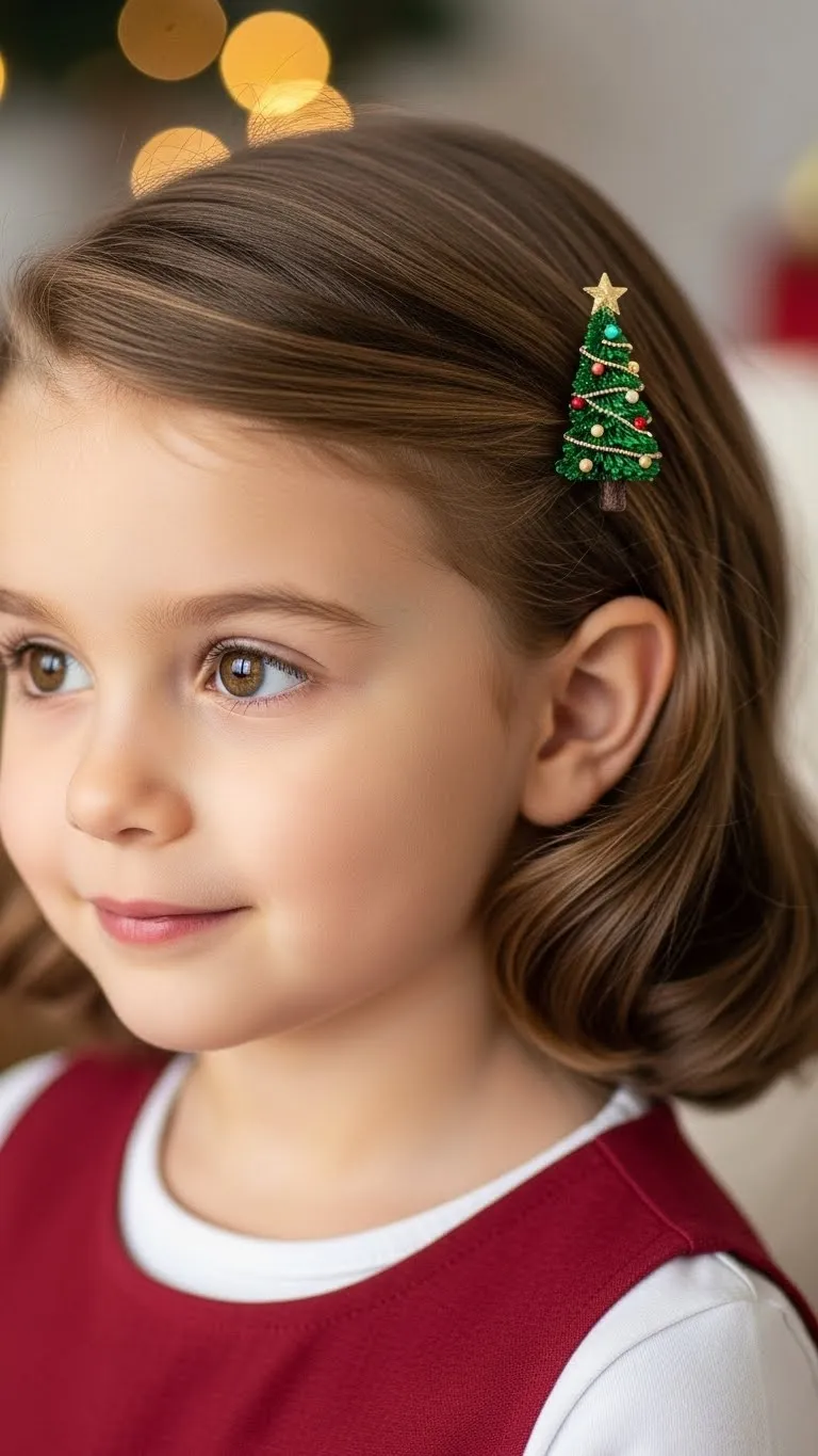 Place one tree-shaped clip on a braid or ponytail. Quick, gentle, and festive. Ideal for kids who prefer something minimal.