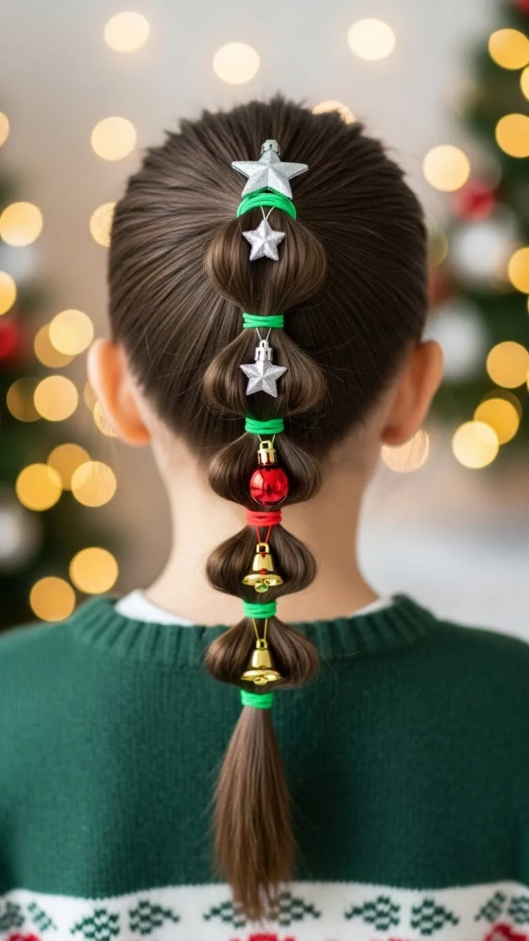Create a high ponytail and add several elastics down the length. Gently fan out each section to form a triangle shape. Add tiny clips or soft ornaments for decoration. Keep the sections loose so the hair doesn’t feel tight. This stays neat through school days and playtime. Choose elastic colors that match an outfit for a cute finish. You can smooth the front with a small dab of gel. Parents like this style because it looks festive but still takes only a few minutes.