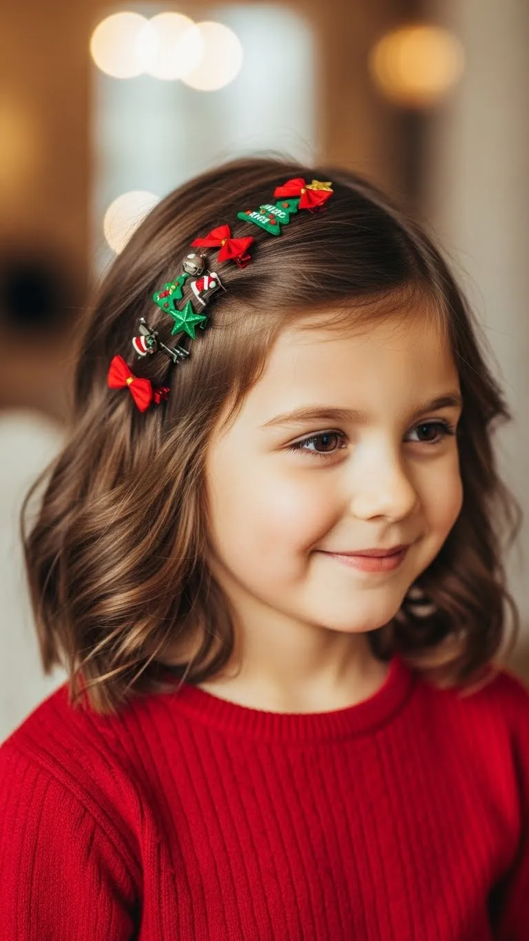 Leave the hair down and place clips in a triangular pattern. It’s fast, gentle, and perfect when you’re short on time. The clips add all the holiday charm.