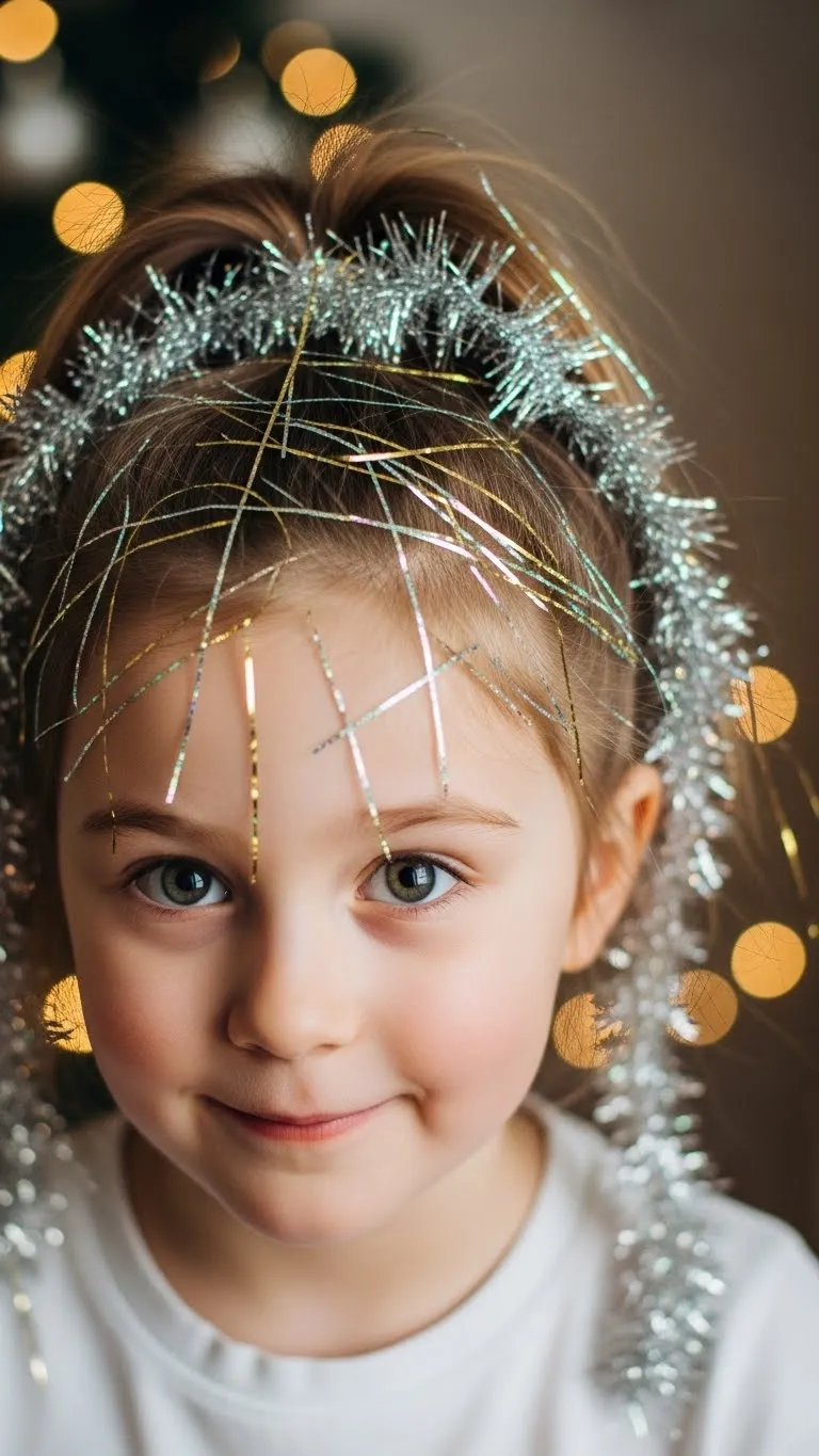 Wrap soft tinsel around a ponytail. Keep it loose so it doesn’t tangle. Add a bow at the base. Works for any hair type and takes seconds.