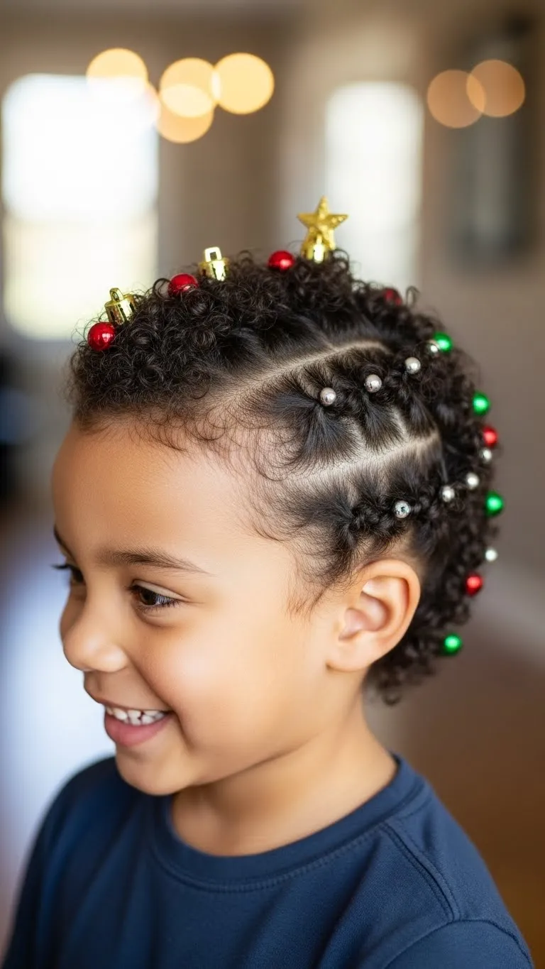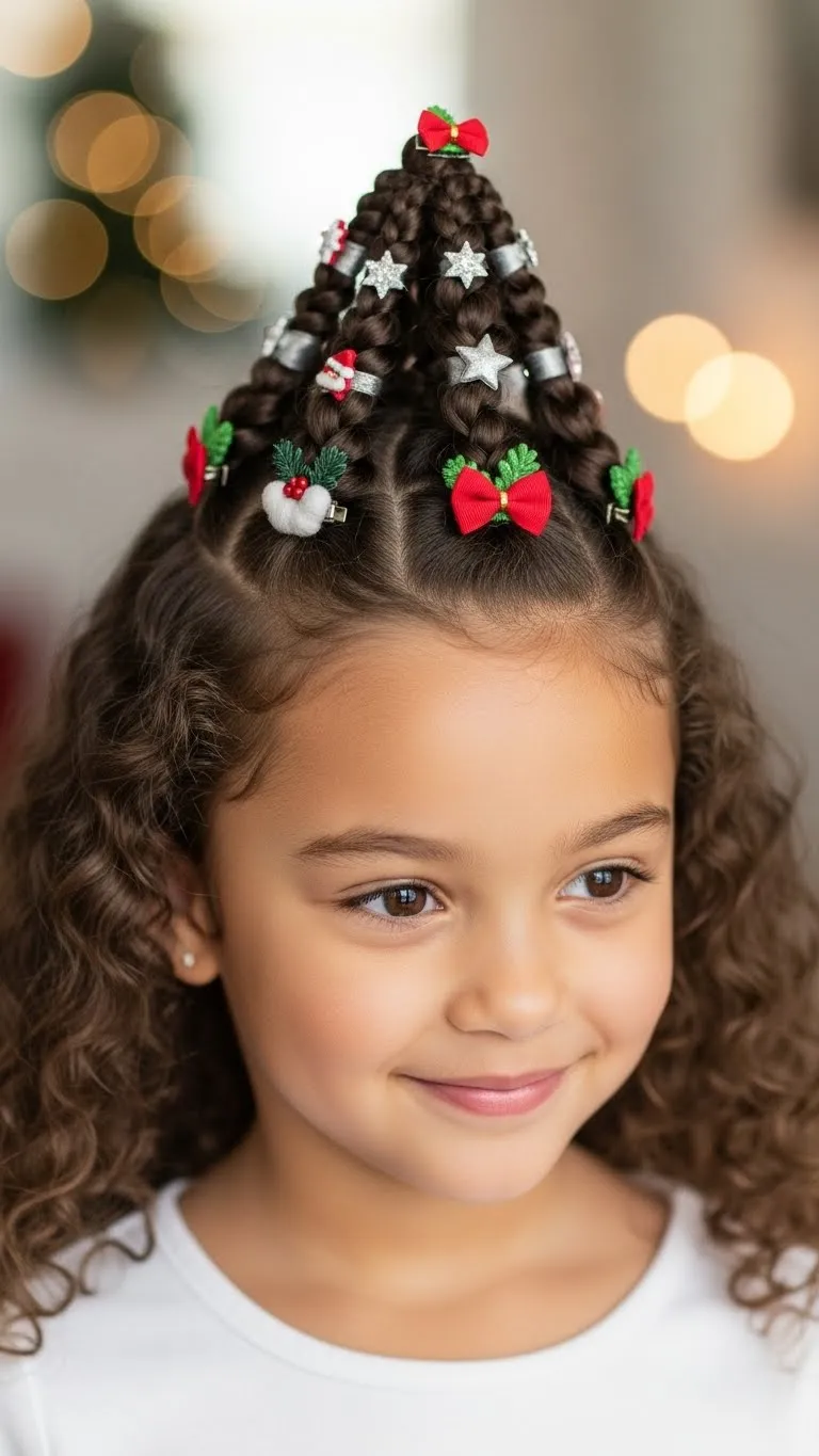 Make small twists on the top section and pin each one outward to shape a cone. Add gentle holiday clips. Twists work nicely on curly textures because they hold easily. Use a light product so the hair stays soft.