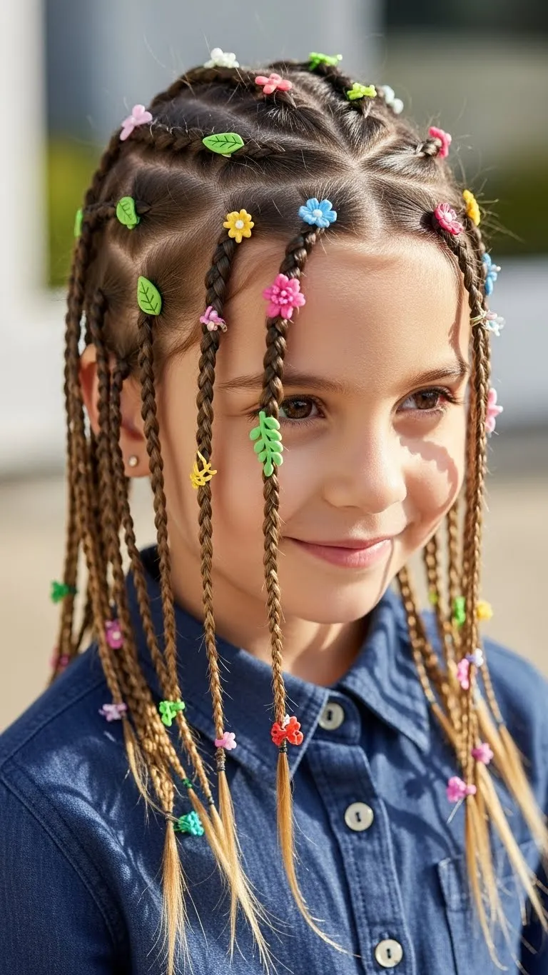 Divide hair into two pigtails. Add small elastics down each one, fanning out the sides to form tiny trees. This style feels playful and comfortable. Decorate with matching clips. Great for school days.