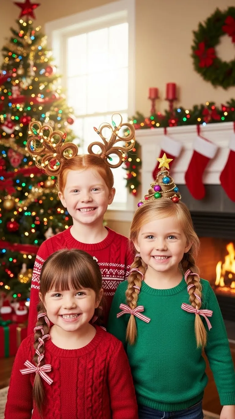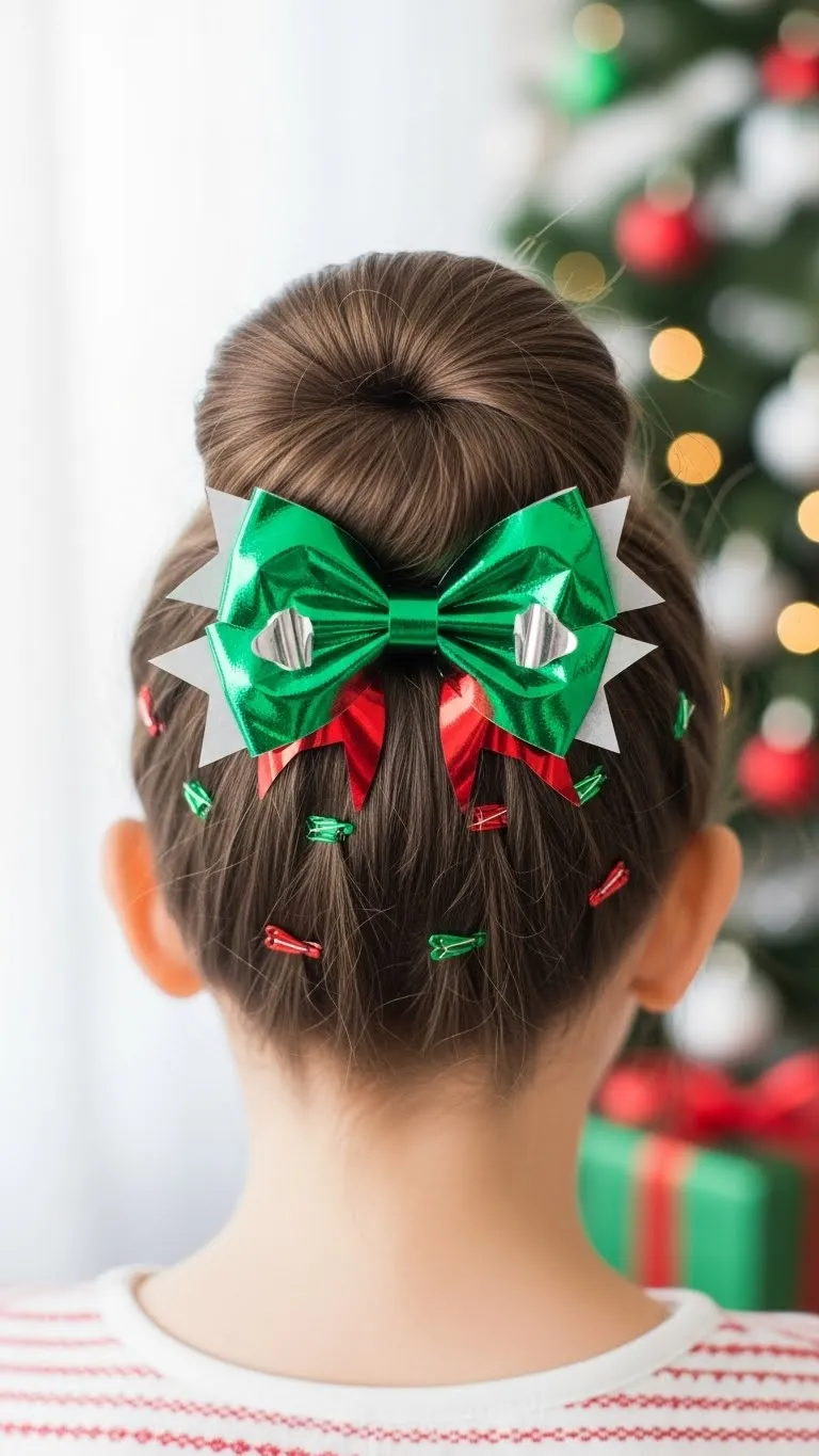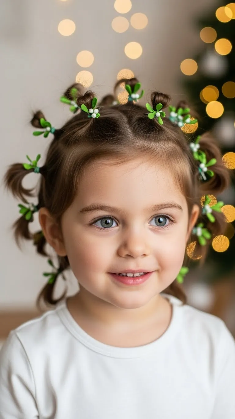 Create several small ponytails across the top of the head. Add mistletoe-themed clips. Kids enjoy the cute green accents. You can make simple versions at home with foam and small berries. This saves money and lets you customize the size. This style works well for short hair. It stays secure during play. It takes only minutes and looks festive for any holiday event.