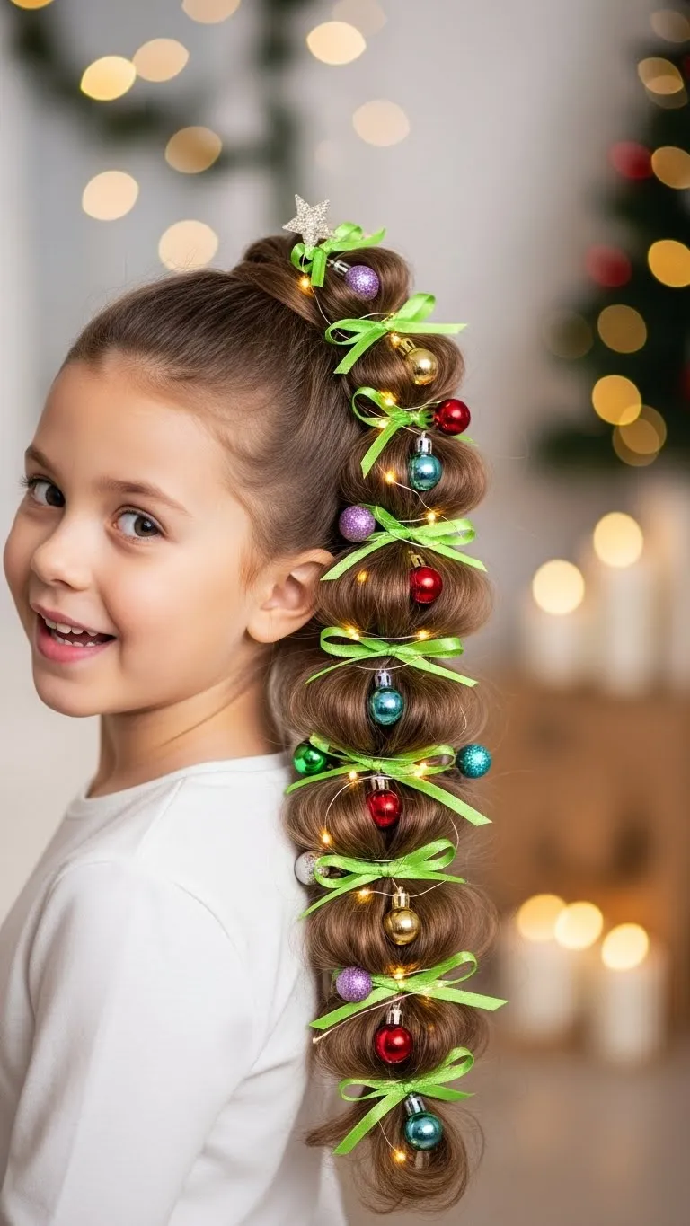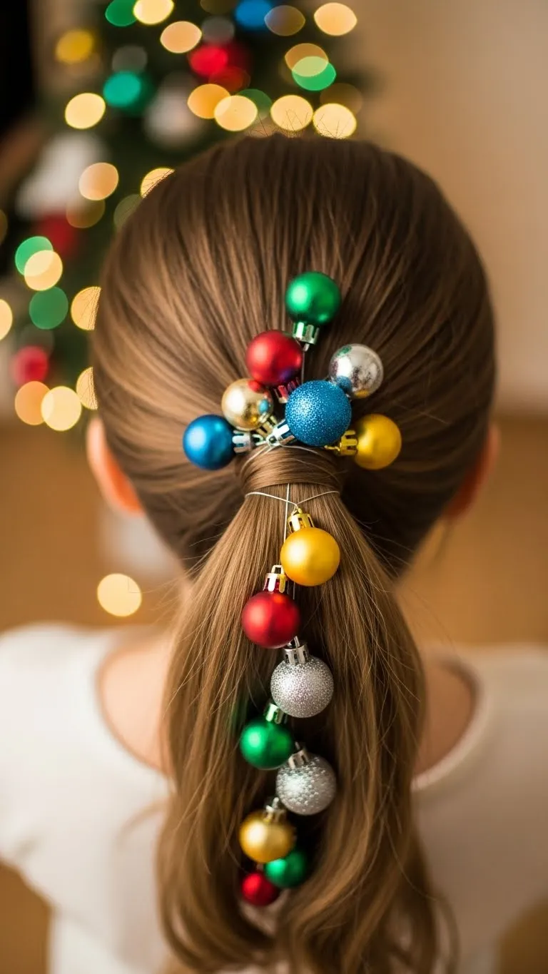 This ponytail uses tiny ornaments for a festive look. Gather a ponytail. Tie small ornaments to elastic strings and wrap them around the base. Make sure the ornaments are lightweight plastic so they’re safe for kids. You can find packs at budget stores. Kids enjoy choosing the colors. This look works for short or long ponytails. Keep the rest simple so the ornaments stand out. It takes little time and stays neat for hours. Great for parties or Christmas photos. Add a bow if your child wants extra flair.