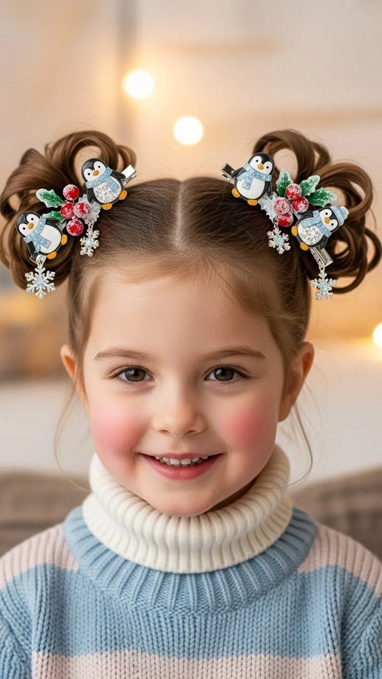 Looped pigtails are simple and cute. Form two pigtails. Instead of pulling the hair all the way through the last loop, leave it halfway to create a round shape. Add penguin clips or small winter-themed accessories. These are inexpensive and easy to reuse. Kids love the cartoon look. This style holds well for active play. Use a small comb to smooth the parts. You can place a ribbon at the base of each loop to add color. Works on short or medium hair. It takes only a few minutes and looks sweet for school events or Christmas gatherings.