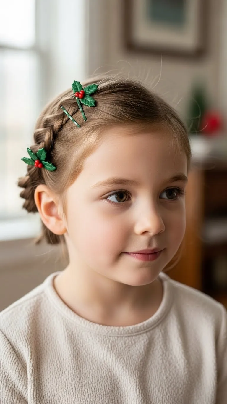 Twist two small sections from the front of the hair. Pin them back with holly leaf clips. Kids enjoy the simple look. It’s gentle on the scalp and suits all hair types. You can make holly clips using craft foam or even felt sheets. This keeps costs low. Light mist helps keep the twists tight. This style is great for casual days or photos. It’s soft, cute, and easy enough for beginners.