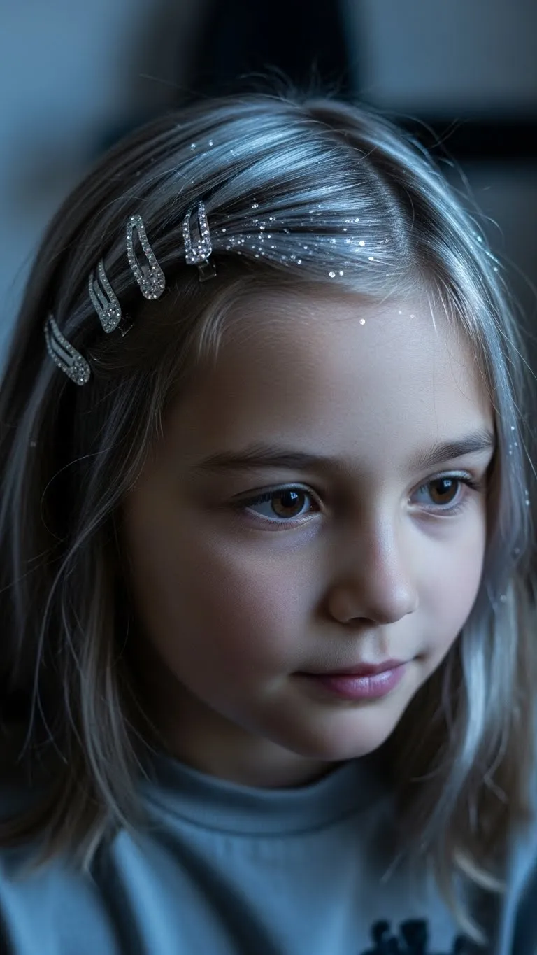 Silver streaks add a winter feel. Use temporary hair chalk or spray. Add sparkly clips for shine. Kids enjoy seeing the shimmer when light hits the strands. This style works on all hair lengths. It takes only minutes and washes out easily. Use a comb to spread the color lightly. You can add more or less depending on the event. This is great for parties, photos, or simple festive fun at home.