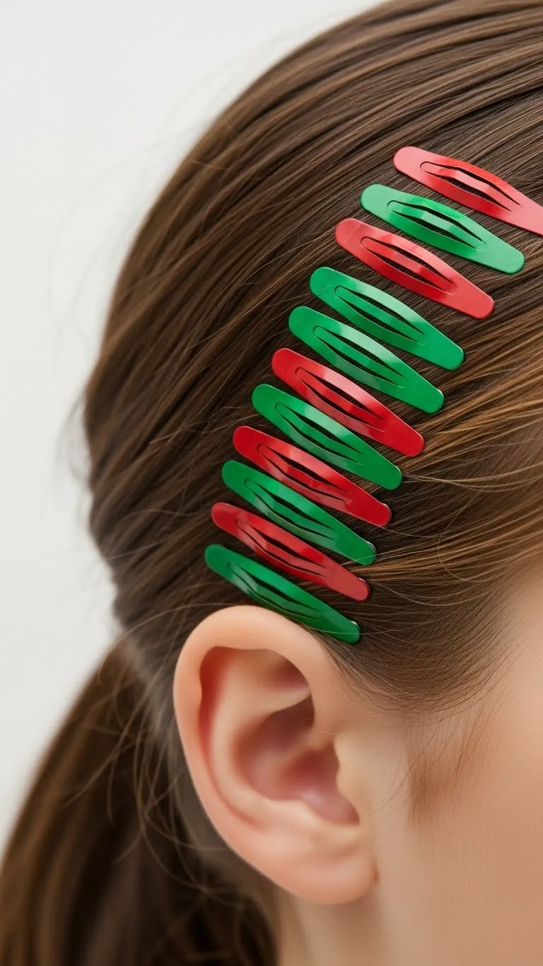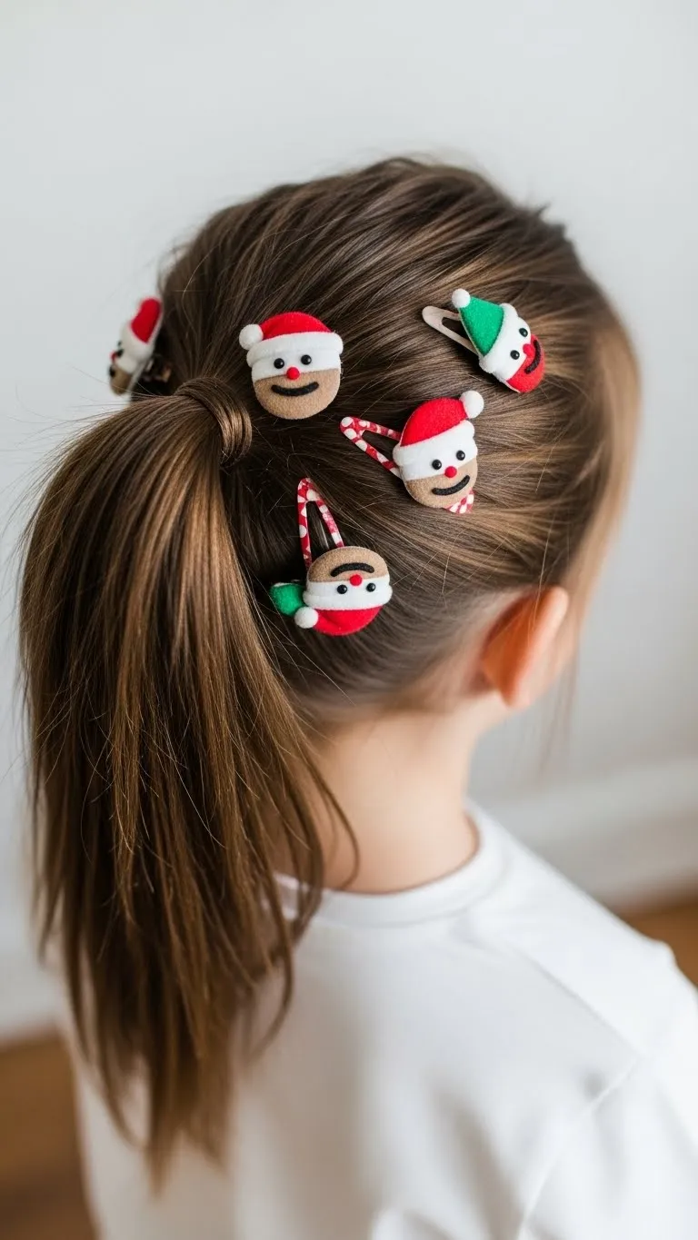 Add themed clips polar bears, candy canes, snowflakes—to a simple ponytail. Place them randomly for a playful look. Kids enjoy mixing different shapes. Craft stores sell packs cheaply, or you can make your own. Spray lightly to smooth the ponytail. This style works for school, parties, or everyday December fun. It takes just a few minutes and adds instant holiday charm.