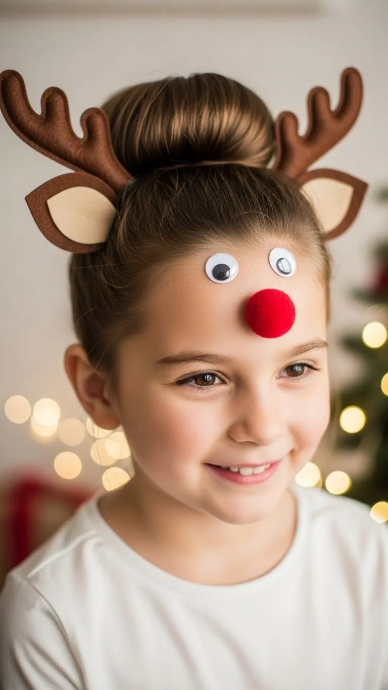 A reindeer bun always gets smiles at parties. Create a high bun and secure it tightly. Add felt antlers using bobby pins. You can make antlers at home from leftover craft foam. Add googly eyes or small white circles cut from paper. For the nose, use a red pom-pom or a small red bow. Kids enjoy wearing this because it looks playful and silly. Keep the bun low-maintenance so it stays put during activities. Light gel helps secure small pieces. If the child has shorter hair, try two space buns to create a tiny “double reindeer” effect. It’s simple and cheap. You can store the antlers and reuse them next year. It’s also a great hairstyle for school dress-up day. Pair it with a brown sweater for a full look. Many parents like this style because it takes less than five minutes. And it photographs well for holiday cards.