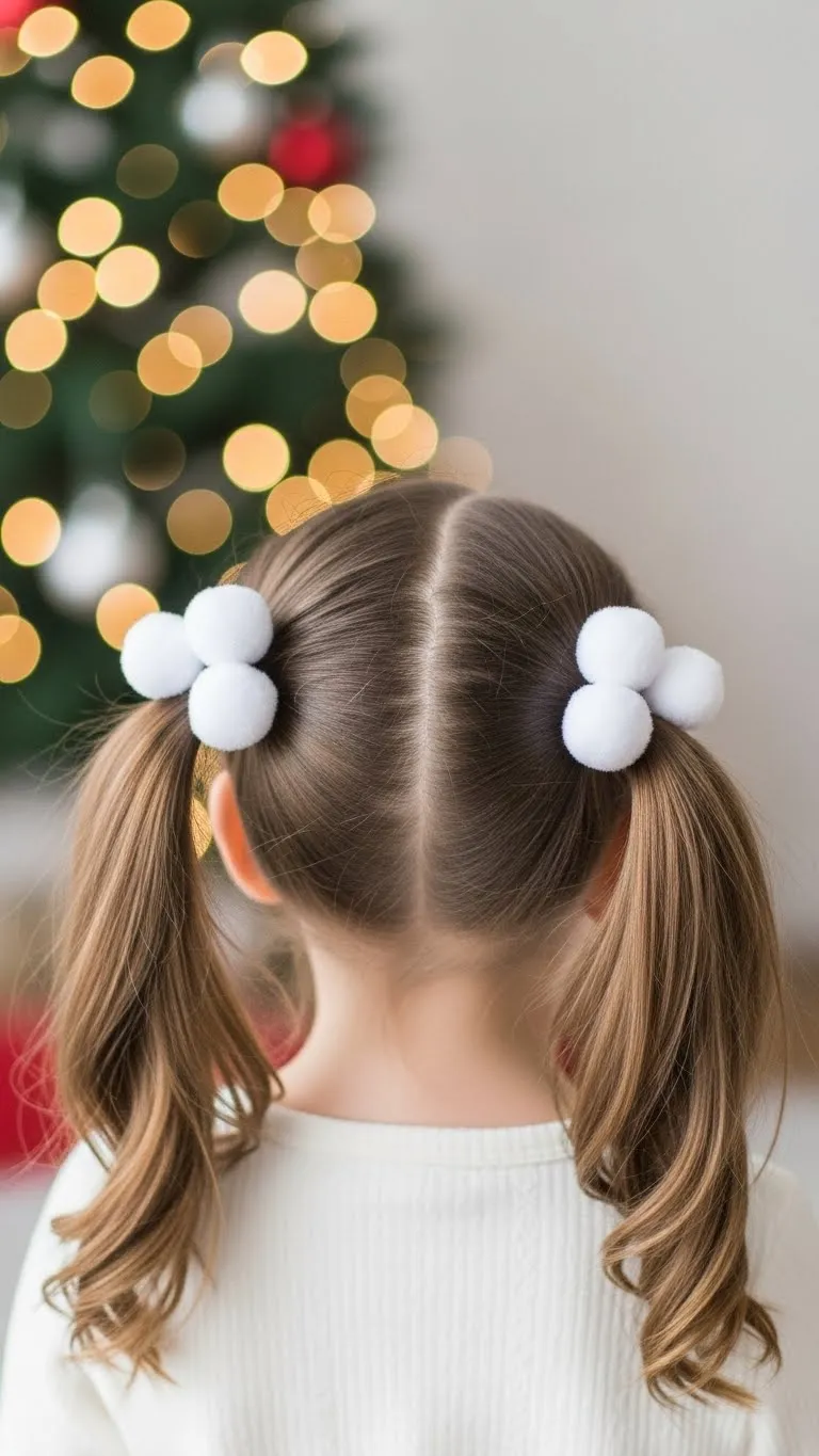 Tie two pigtails. Add white pom-poms to the elastics. They look like tiny snowballs. Kids think they’re soft and funny. You can buy a pack cheaply at craft stores. This style works on all hair textures. Smooth the hair with water for a tidy look. It stays cute through school and play. Quick, simple, and adorable for winter days.
