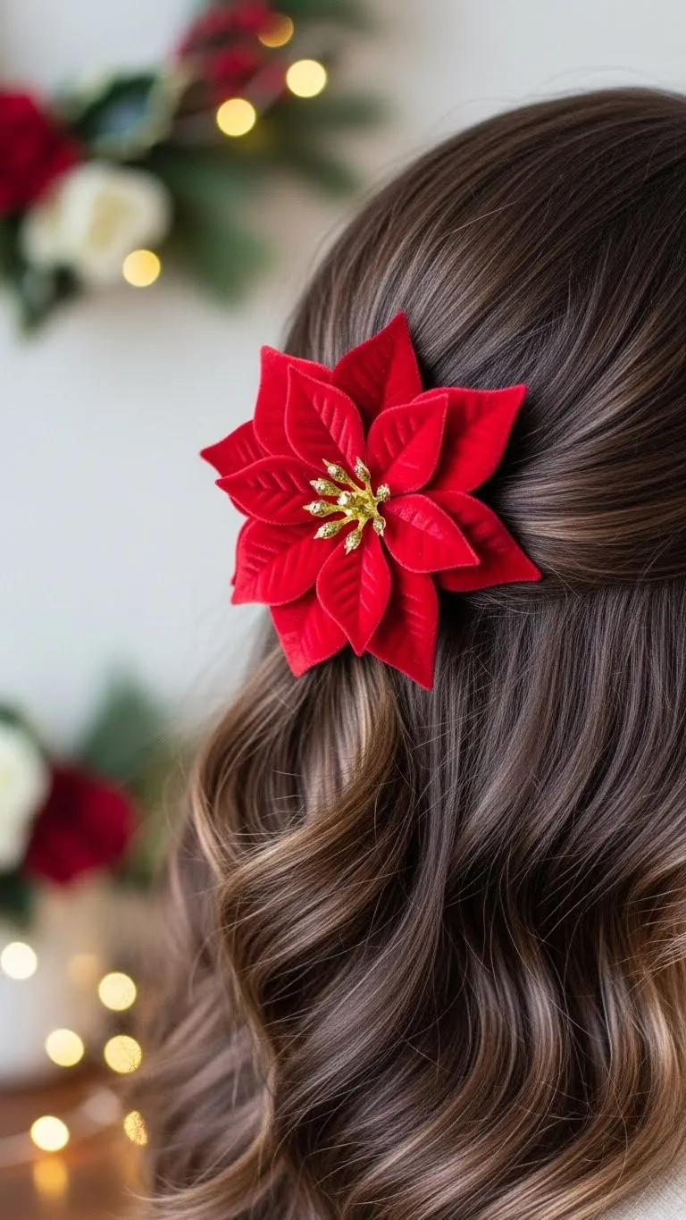 Sweep the hair to one side. Pin it with a poinsettia clip. You can make one using felt or buy one cheaply. Kids love the bold red color. This style looks elegant yet easy. Spray a little water for smoothness. Works with long or short hair. Great for church events, photos, or holiday meals. It takes under two minutes to create.