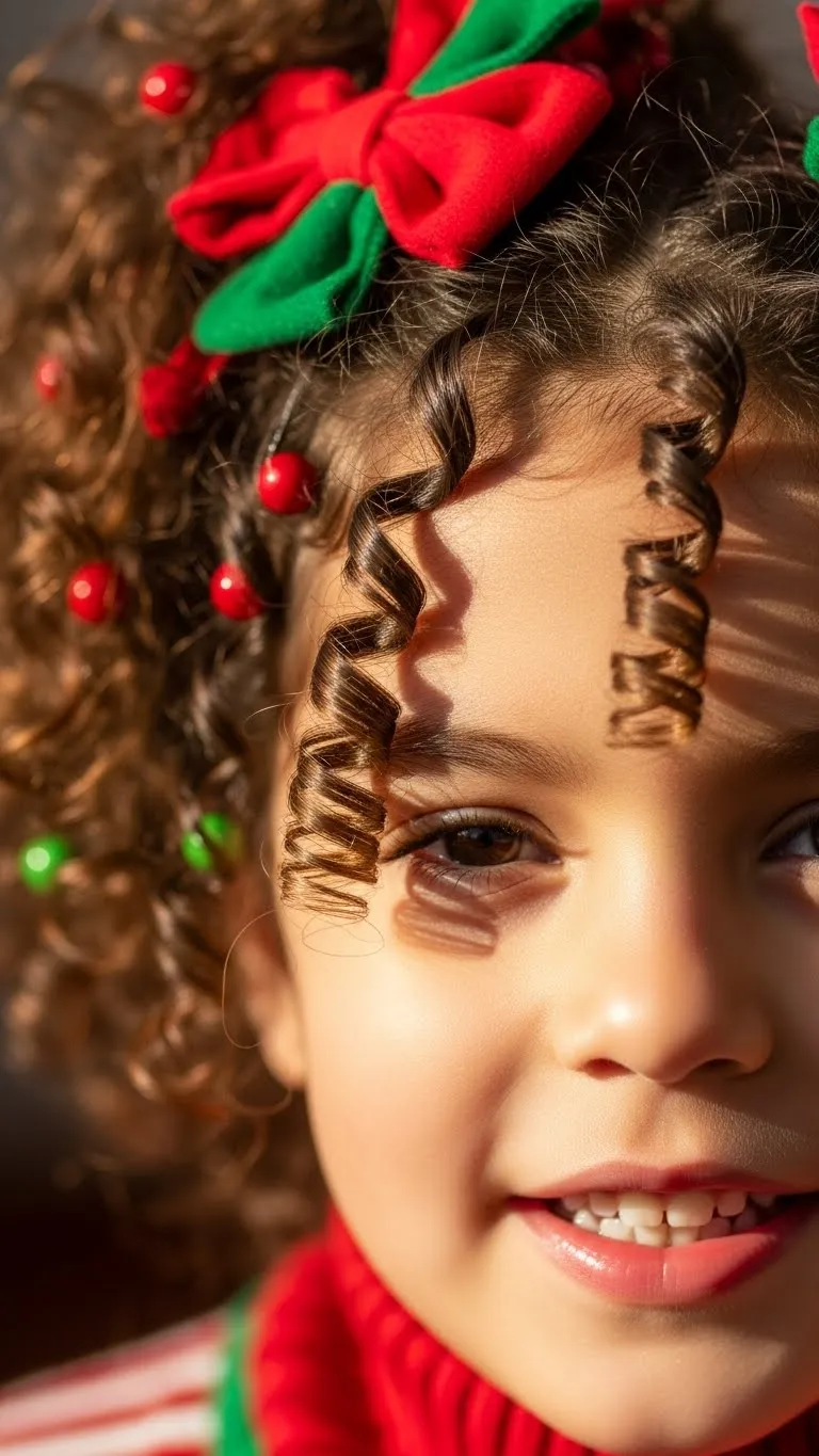 Add a few spiral curls using heatless curlers or soft foam rods. Kids love the bouncy effect. Add small red and green clips. This style works well on medium or long hair. It takes little effort if you prep curls the night before. Spray lightly with water to refresh the shape. Great for photos and parties. It feels fun without needing complicated steps.