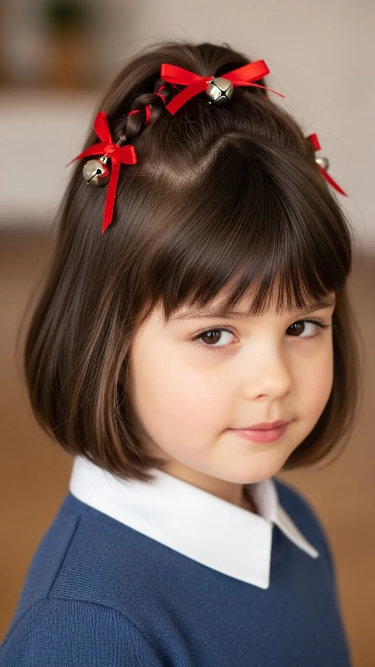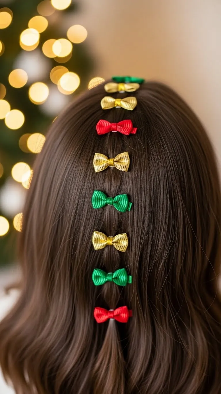 Place mini bows along the part line. Kids enjoy picking the colors. Use red, gold, green, or mixed shades. This style works on all hair lengths. It’s easy, clean, and fast. Light mist helps keep the part neat. This is a great choice for parents who want something cute with no extra work. It pairs well with any outfit.
