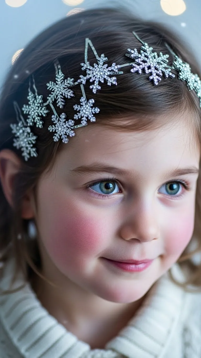 This style uses clips to form a crown shape. Start by parting the hair in the middle. Place snowflake clips along the top of the head in a curved shape. Use clips of different sizes for a fun look. Kids enjoy picking the colors—silver, white, or blue work well. This hairstyle is quick, especially for mornings when time is tight. It works on straight or curly hair. Add a light spritz of water to smooth flyaways. Most dollar stores carry snowflake clips during the holiday season. You can also make your own with glitter foam or leftover craft supplies. This style pairs well with holiday dresses and sweaters. And because it takes only a few minutes, it’s perfect for busy families who want something cute without extra work.