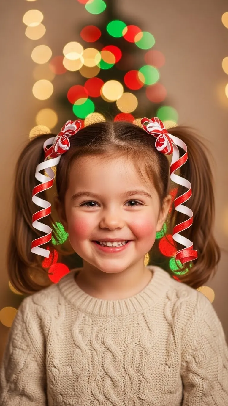These pigtails look like candy canes. Put the hair into two high or low pigtails. Wrap red and white ribbons around each one, switching colors every few inches. Keep the ribbon loose enough to see both shades clearly. Tie the ends with small bows. This style works well for school events and holiday parades. Kids love the bold colors. You can use yarn instead of ribbon for a softer feel. It’s budget-friendly and takes only a few minutes. If your child has short hair, wrap the ribbon around hair elastics instead. It still gives a candy cane look without needing long hair. Light misting helps smooth the strands and keeps the ribbons in place. This style looks cute in photos and stays put during play.