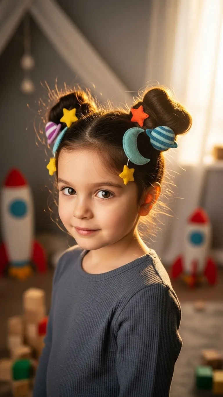 Kids adore the sound of tiny jingle bells. For this style, pull the top half of the hair into a small ponytail. Attach miniature bells to ribbons and tie them around the elastic. The bells make soft sounds when the child moves. Make sure they’re lightweight so they stay comfortable. You can find mini bells at craft stores for a low price. Add a bit of smoothing spray to keep the top neat. This look works on short or long hair. Kids wear it to school, parties, or family gatherings. It’s simple, fun, and gets lots of attention.