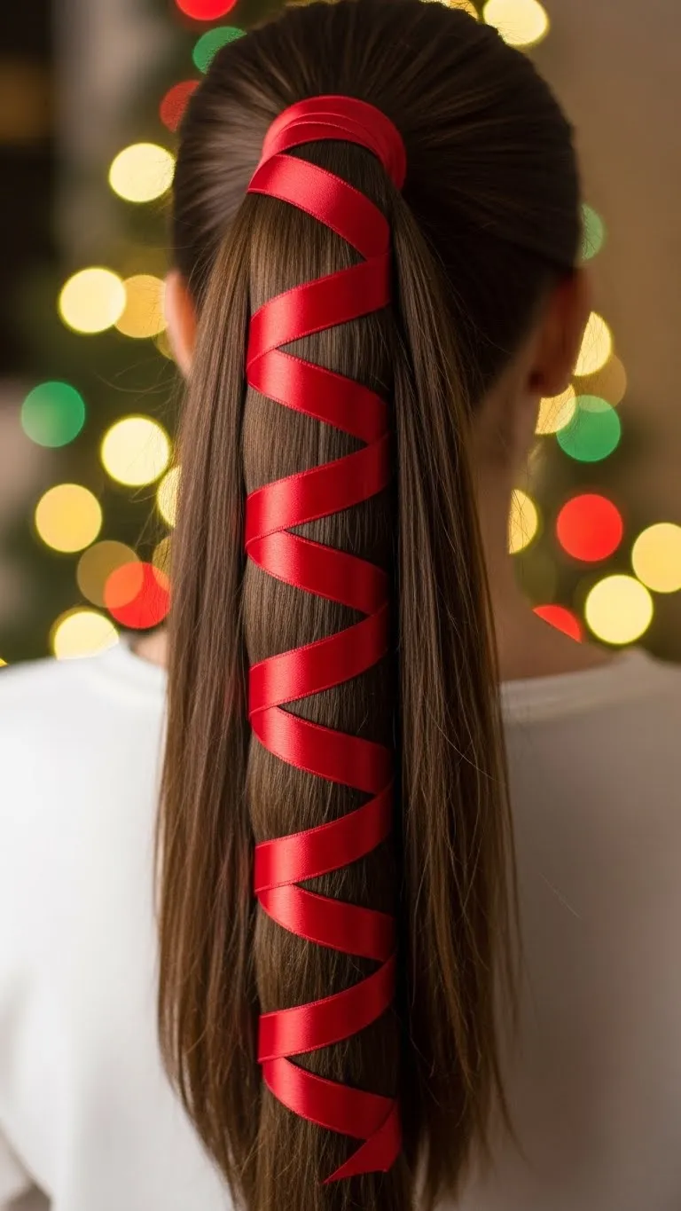 This ponytail looks fancy but takes little time. Start with a smooth ponytail. Wrap a wide ribbon down the length, leaving small gaps. Kids like choosing their own ribbon colors. Red, gold, and silver are popular. Tie a bow at the base for a cute finish. This style works well on all hair types. Use water to smooth bumps. You can add a few small clips for sparkle. Ribbon is low-cost and reusable, making this perfect for budget-friendly looks. If the hair is short, wrap ribbon around the elastic instead. This still gives a holiday feel without needing long strands. It stays neat through school activities and is simple for busy mornings.