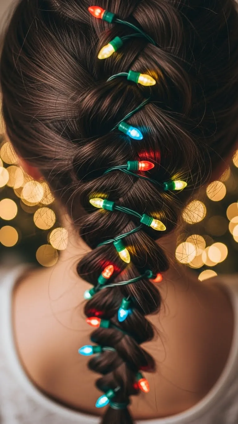 A lights braid looks bright and cheerful. Start with a basic three-strand braid. Add bulb-shaped clips every few inches. Use colors like red, green, yellow, and blue. You can buy a pack of plastic light clips at discount stores. They’re safe and lightweight. Kids love choosing the pattern. This look works on medium or long hair. It’s a quick style that stays together during activity. If the hair is shorter, create a small side braid instead. Light mist keeps flyaways down. This braid photographs well for holiday pictures and is easy enough for everyday wear during Christmas week.