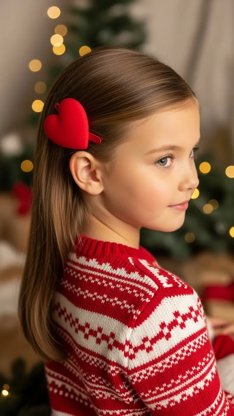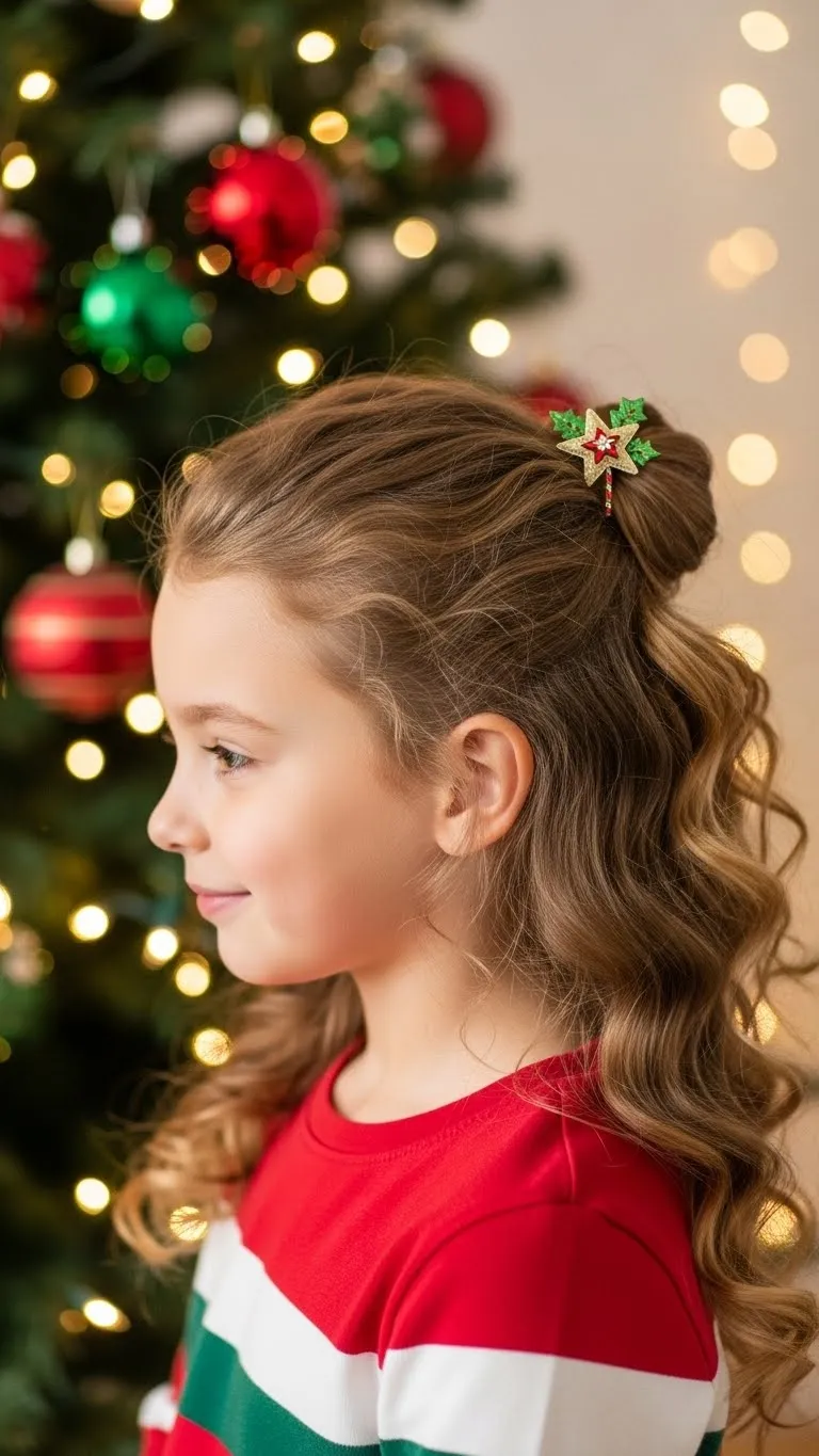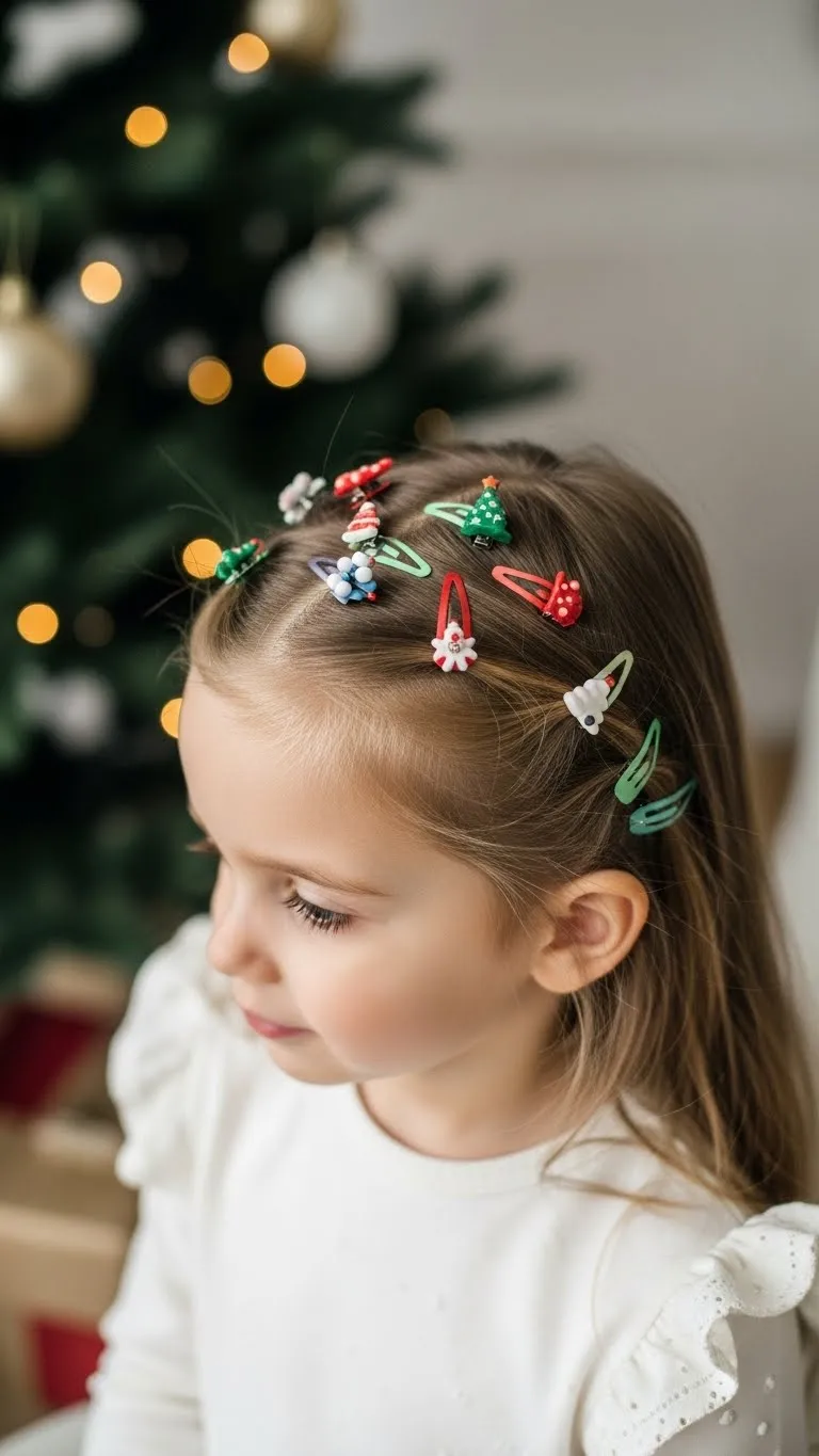 Add several tiny holiday clips—stars, snowflakes, or bows—throughout the hair. Place them lightly so they stay comfy. Works beautifully for both long and short hair. You can mix colors or match a theme. Kids love this style because it feels playful and fun.