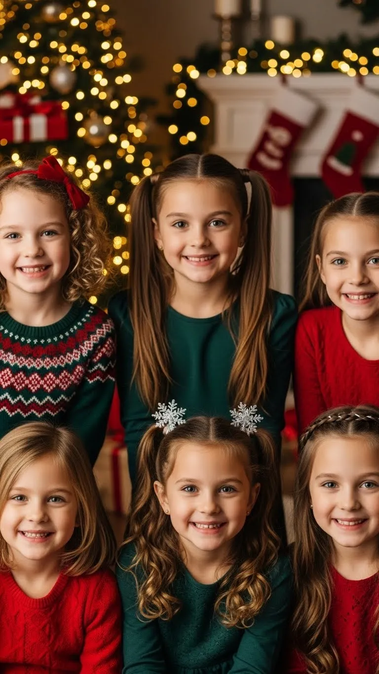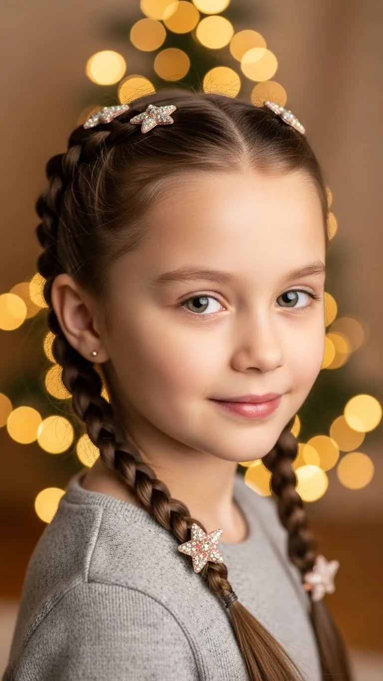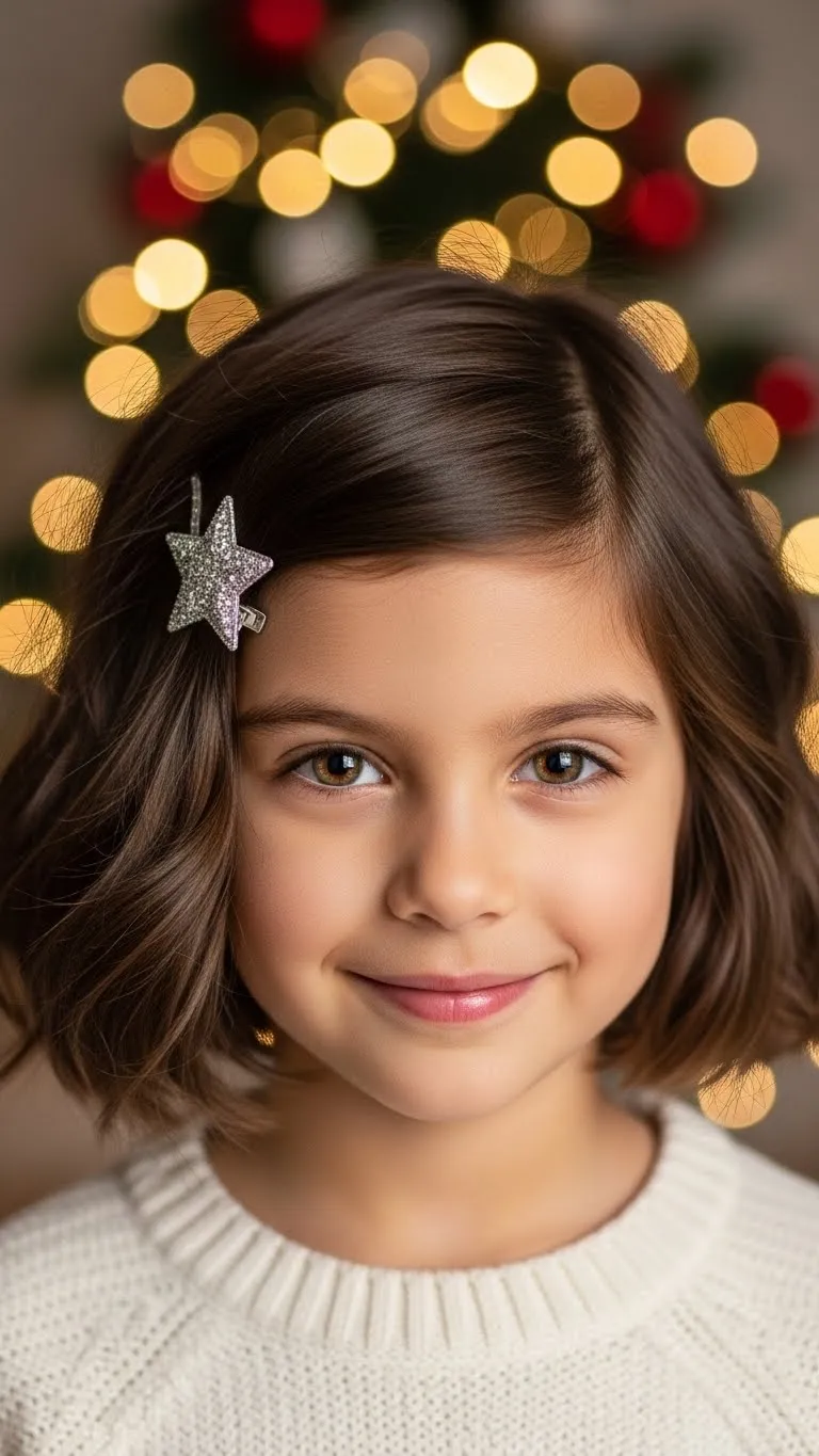 Add several tiny holiday clips—stars, snowflakes, or bows—throughout the hair. Place them lightly so they stay comfy. Works beautifully for both long and short hair. You can mix colors or match a theme. Kids love this style because it feels playful and fun.