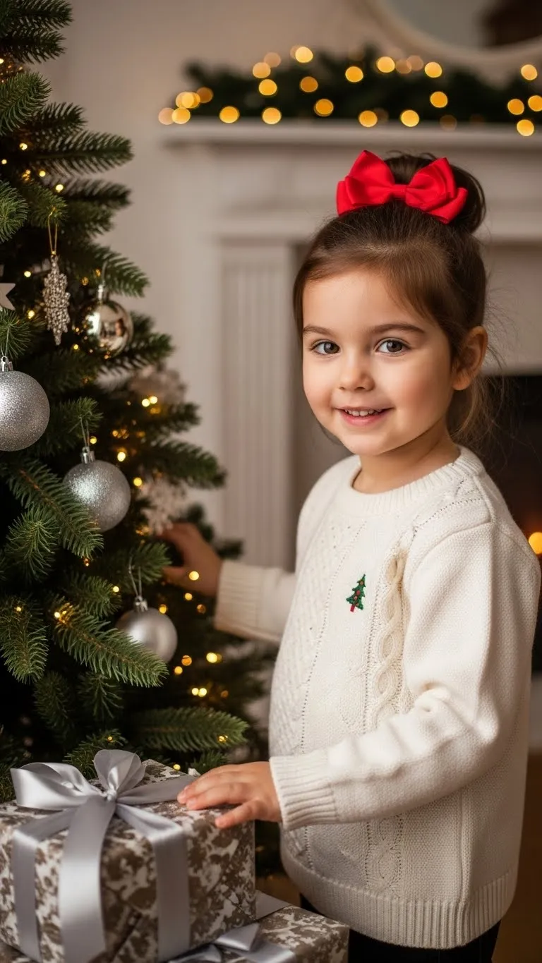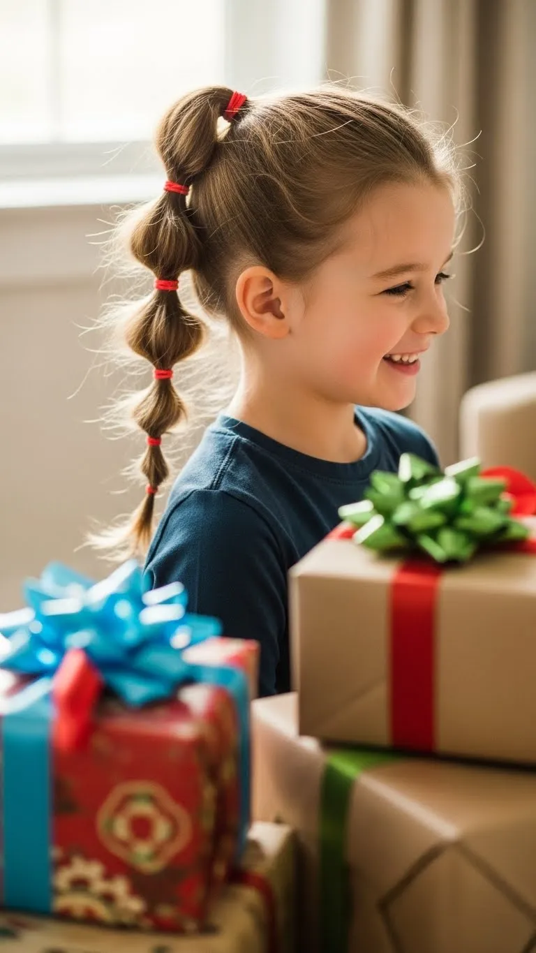 Create a low side ponytail and tie it with a holiday bow. Keep it loose so it feels soft. Smooth the top with a bit of water if needed. This look works for all hair types and takes under a minute to create. It’s great for kids who prefer simple, tidy styles.