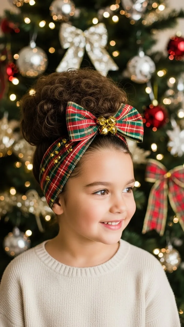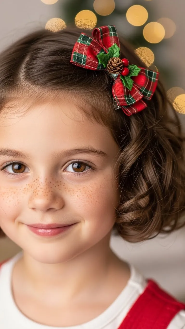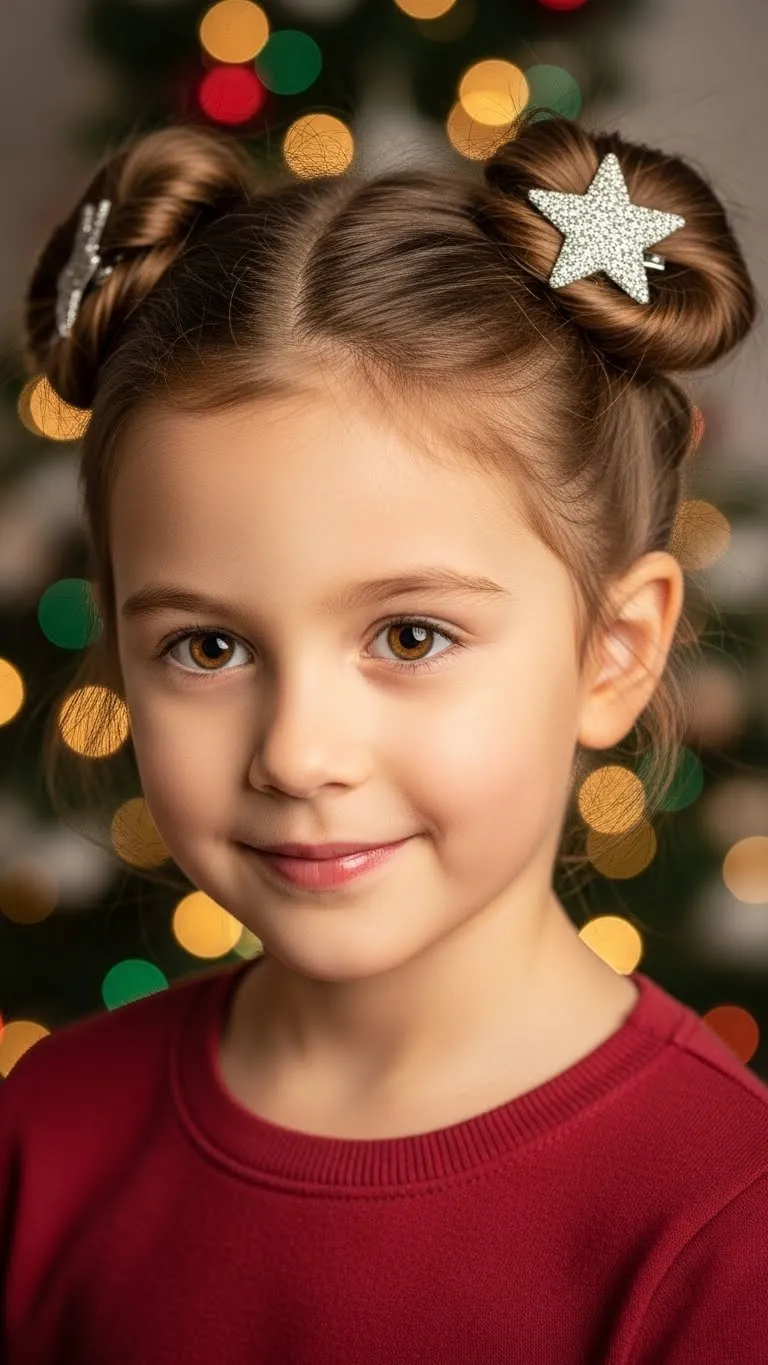 Add several tiny holiday clips—stars, snowflakes, or bows—throughout the hair. Place them lightly so they stay comfy. Works beautifully for both long and short hair. You can mix colors or match a theme. Kids love this style because it feels playful and fun.